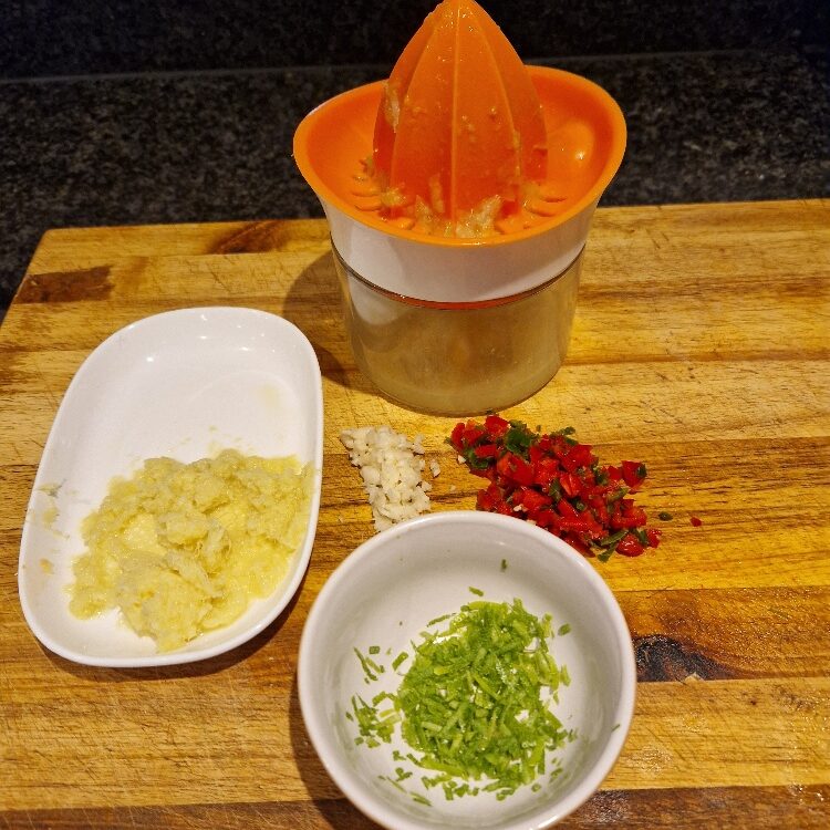 - First prepare your key ingredients. Chop the chillies, including the one for the dressing; also chop the garlic. See our garlic & chilli Tip. Peel and grate the ginger. See our ginger Tip. Zest and juice the lime(s), then cut the zest smaller. See our citrus Tip. Cut the spring onions into small rounds.