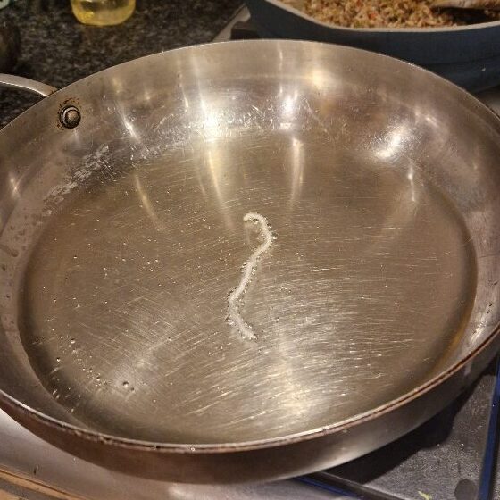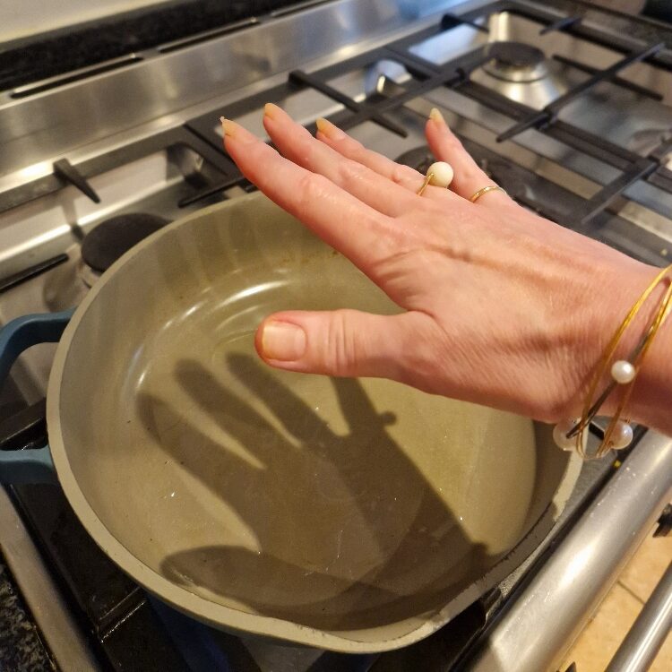 First, set a deep frying pan over a high heat and add a generous slug of groundnut oil, today we used about 3/4 cup of oil for our size of pan – if yours is larger or smaller you’ll need to adjust. You need a definite pool of oil into which to submerge your noodles.
