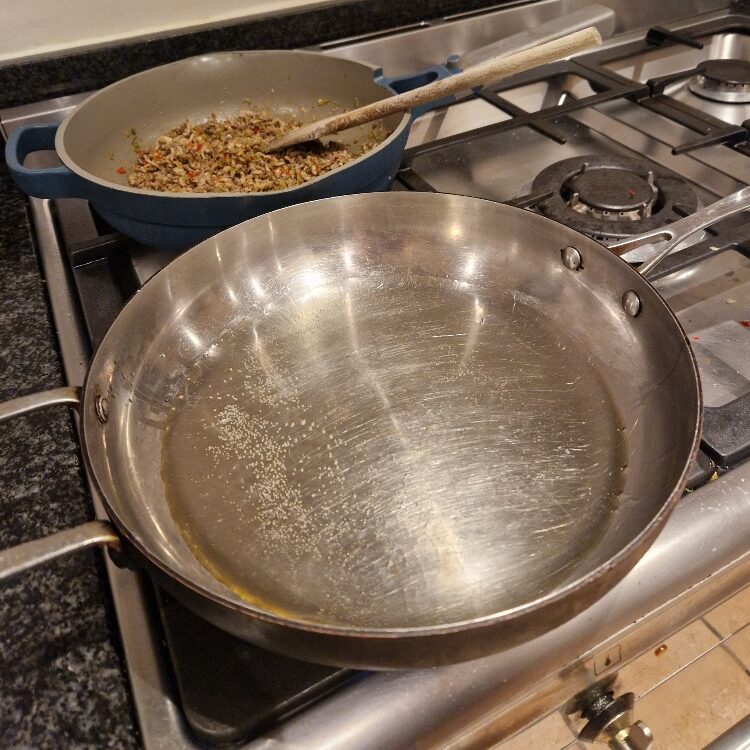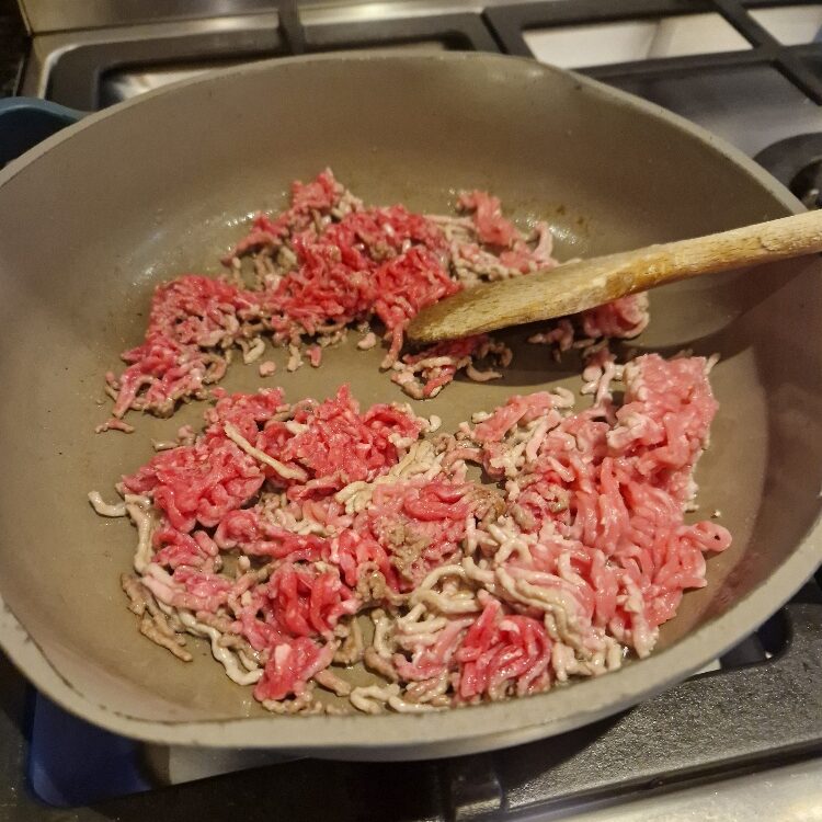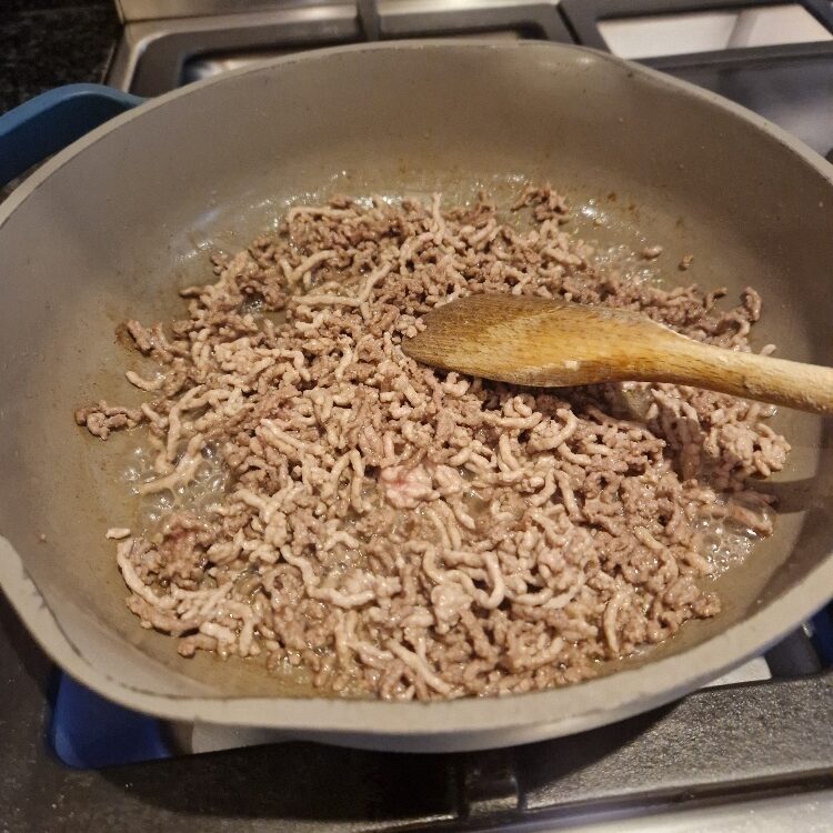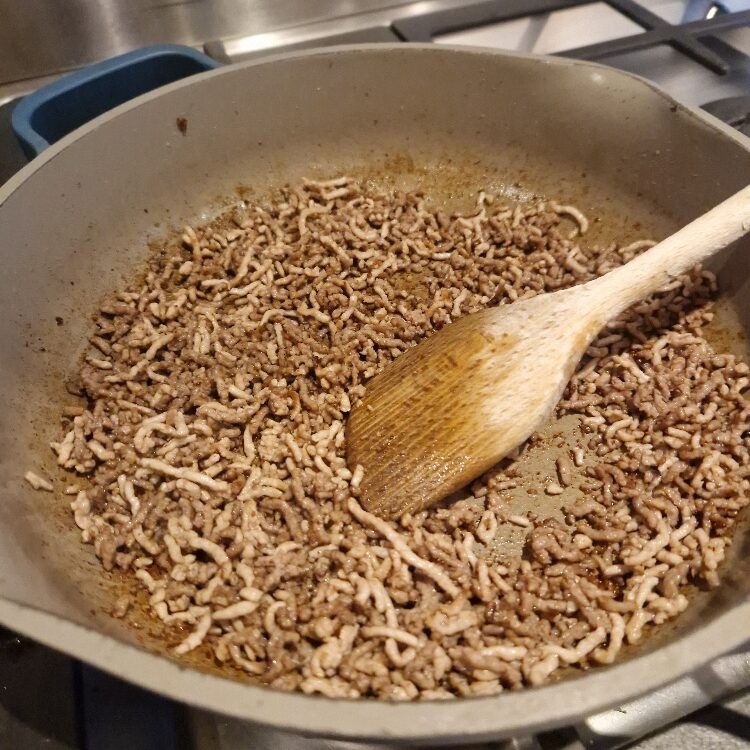 You are now ready to cook the meat. The method for this is very similar to what we did in the spaghetti recipe, but in this dish we want the meat really dry and almost crispy, so we will fry it drier, hotter and longer.