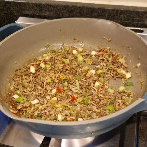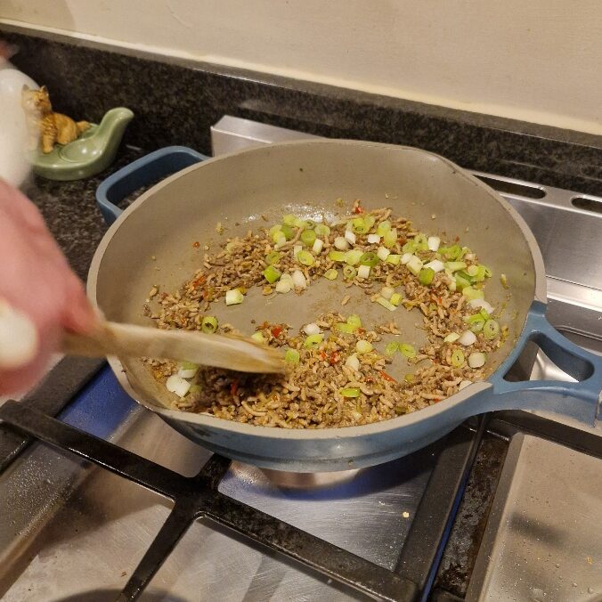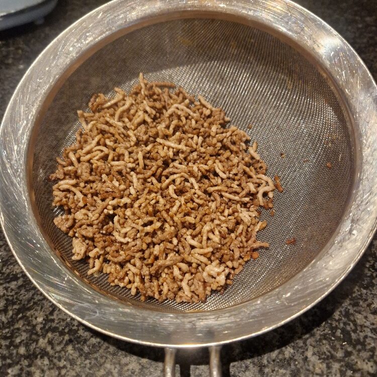Put a large, preferably non stick, frying pan over a high heat and add a little oil. Test the pan’s heat by holding your had over it – it is hot enough for this dish when you feel you want to move your hand away, and the oil should be sizzling slightly. Add the meat, and keep stirring it until the it is all fully browned and also dry and crumbly looking, as in the final pictures below. This will probably take at least 7 to 8 minutes, possibly a little more. The meat should be slightly crisp. Once it is ready, drain in a sieve to help keep it dry, and set aside until you just before you are ready to serve.