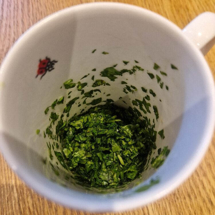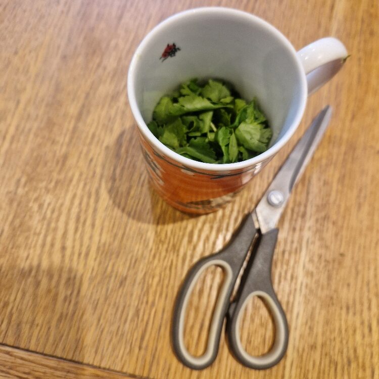 You are now ready to make the dressing. Start by chopping the fresh coriander, just as we did for the parsley in the spaghetti recipe. You can find out how in our herb Tip. You only need a relatively small amount, about a medium handful, and it should be chopped quite fine.