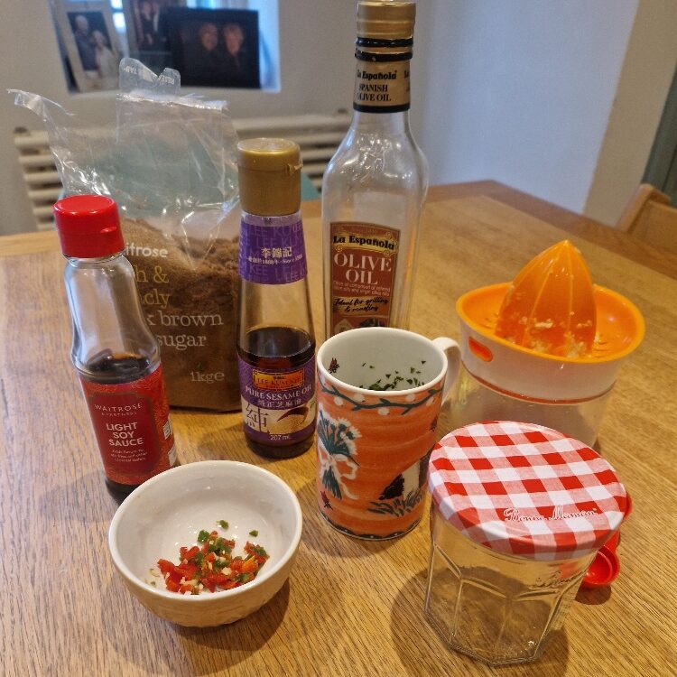 - Next prepare the dressing. Chop the coriander. See our herb Tip. Add the brown sugar, soy sauce and one generous tablespoon of the lime juice to a clean jam jar and stir until the sugar dissolves. Set the remaining lime juice aside. Add the sesame oil, fish sauce and one tablespoon of the olive oil to the jar and shake vigorously until emulsified. Add two more good tablespoons of the oil and shake again. See our dressing Tip. Stir in the coriander and about a teaspoon of the chopped chillies, setting the rest aside. Taste and adjust with any of the flavourings until liked.