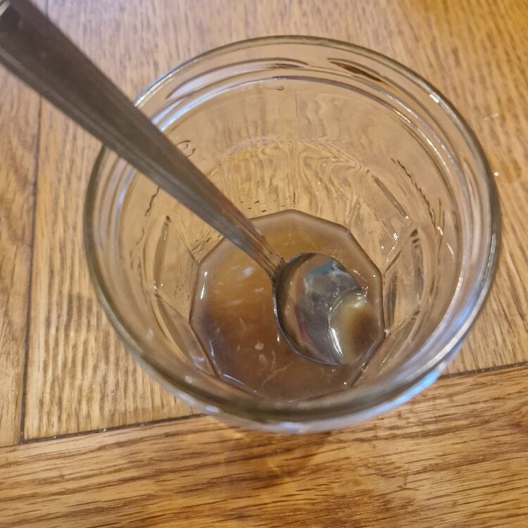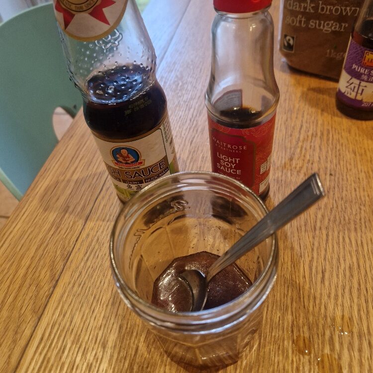 First, add a teaspoon of brown sugar and a generous tablespoon of the lime juice plus a tablespoon of light soy sauce to the jar, and stir with a teaspoon until the sugar is fully dissolved. If you don’t have brown sugar you can use caster or any other sugar, but brown gives the dressing a nice caramelly richness. Add one teaspoon of sesame oil, one tablespoon of olive oil and a teaspoon of fish sauce, put the lid on the jar and shake vigorously until the oil and liquid emulsify – it will look thick and creamy. Add two more generous tablespoons of olive oil, and shake the jar vigorously again until the dressing looks pale and glossy as in the fourth picture below. See more about the basic method in our Tip. If you are making the dressing in a bowl you’ll need to use a small whisk as a substitute for shaking to emulsify.