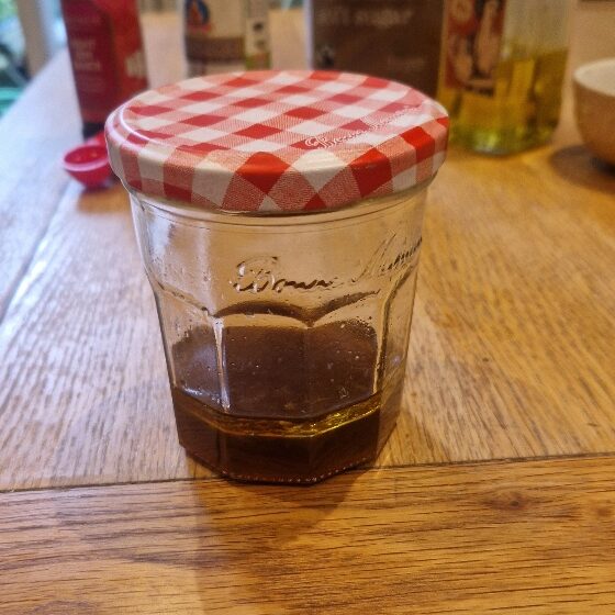 The base of this dressing and the technique are quite similar to our classic vinaigrette, which you’ll meet versions of in later recipes and in our vinaigrette Tip. We find it easiest to make dressings in a clean dry jam jar, but you can do in a small bowl if you don’t have one to hand.