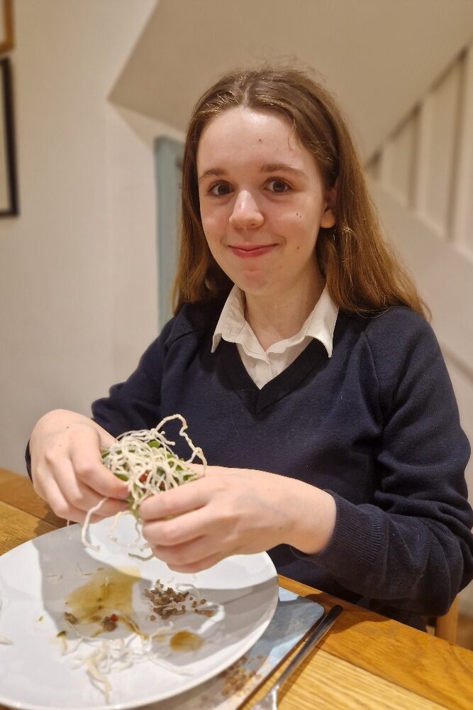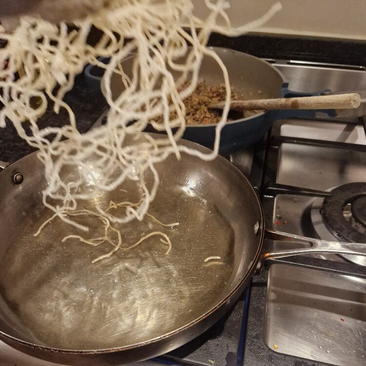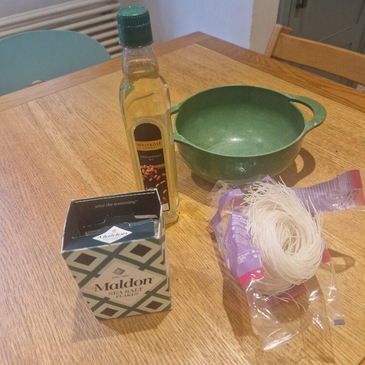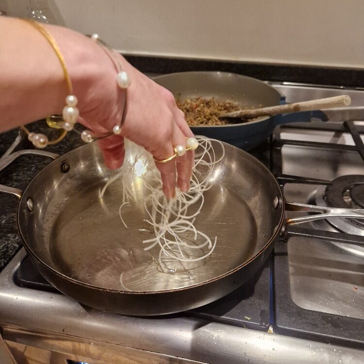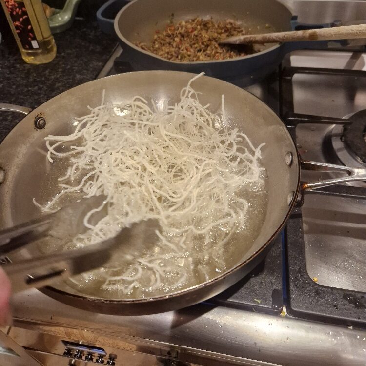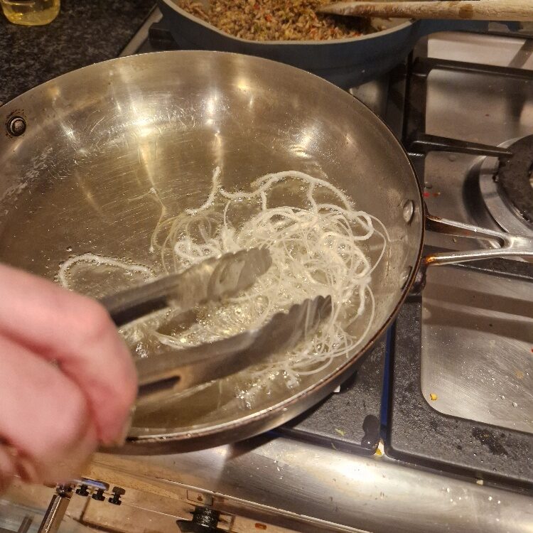 You can now prepare the noodles. The noodles you need for this are the dried thin rice noodles, also known as vermicelli noodles. You can sometimes find packets of straight folded ones, which are slightly easier to work with for this dish, but most often you’ll find them as nests like ours were today. You’ll also need an oil for frying that heats up well – we find groundnut works very well, and has a nice neutral flavour.