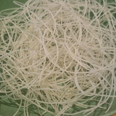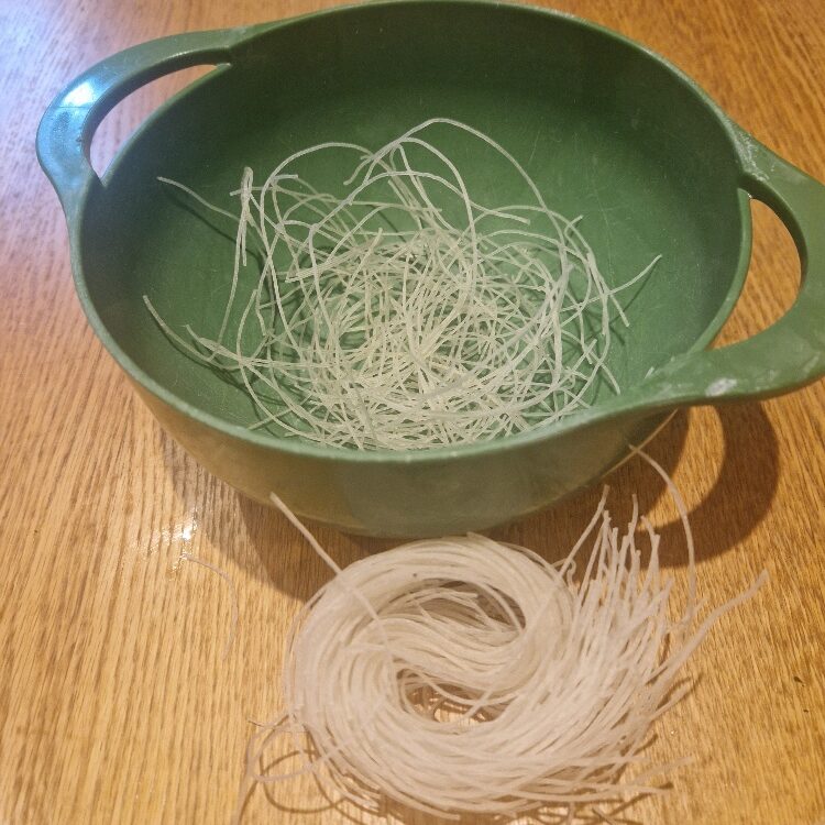 Whichever shape of rice noodles you have, you’ll need to pull them apart and break into long strands, as below.