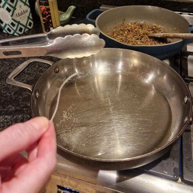 To test if the oil is hot enough, take one strand of noodle and put it into the oil – you can either use one long noodle, and hold onto one end as you test, or break off a smaller piece and drop into the pan. If the oil is hot enough, as soon as the noodle touches the oil it will immediately ‘bloom’ and puff up. If this doesn’t happen, remove the noodle and discard. Wait a little longer for the pan to heat and then test again. A none puffed noodle (oil not hot enough) is on the left, a puffy one is on the right:
