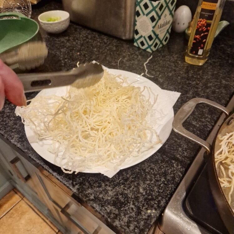 You are now ready to fry! You’ll be frying in batches so have some tongs handy, and also a plate covered in kitchen towel to keep the fried noodles on and soak up any excess oil. Place a handful of noodles into the pan, they should start to puff immediately, and then turn them at least once with the tongs so all parts of the noodles have touched the oil – we tend to just keep them moving. When all (or most) of the noodles have puffed up, and before they start to brown, remove from the heat to drain on the kitchen towel. Repeat until all your noodles are fried.