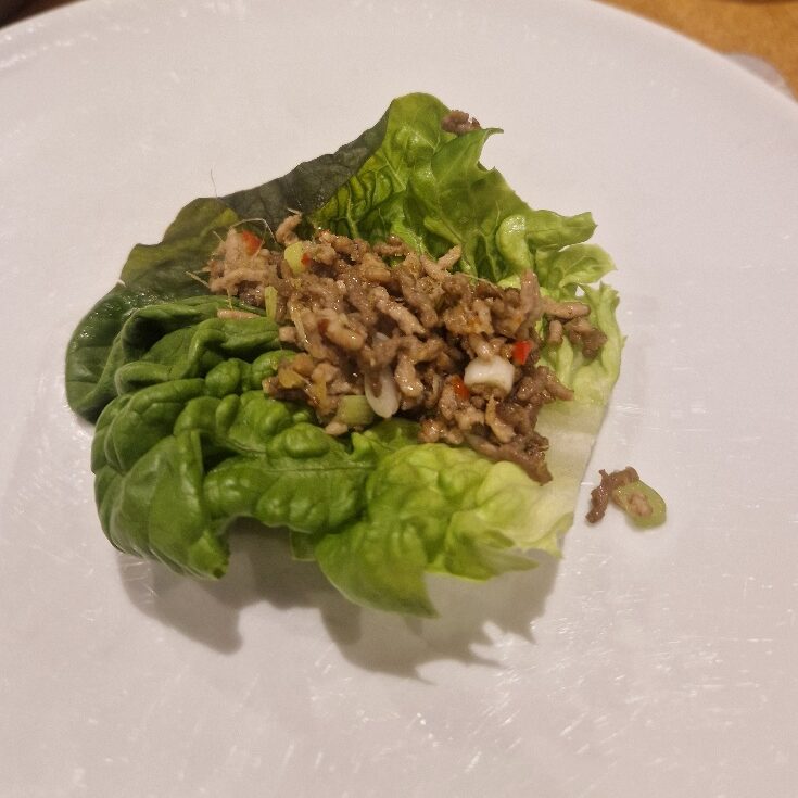 - To serve, place a lettuce leaf on your plate and top with a little of the mince mixture. Spoon over a little dressing, then top with some crispy noodles. Roll up the lettuce wrap and enjoy!