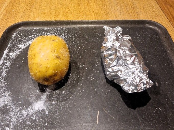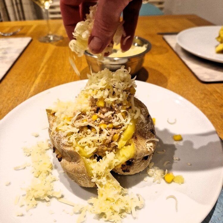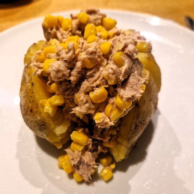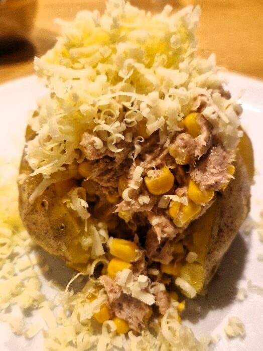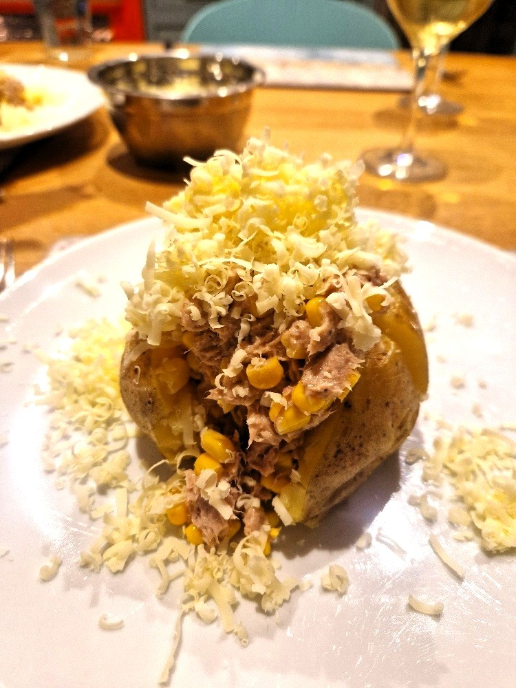 We still really like that simple topping, but today we normally add tuna too – though leaving the tuna out is fine, especially if you want it to be vegetarian. You need to allow time to bake potatoes – normally over an hour. But apart from that this classic student supper dish is very quick and easy to make.