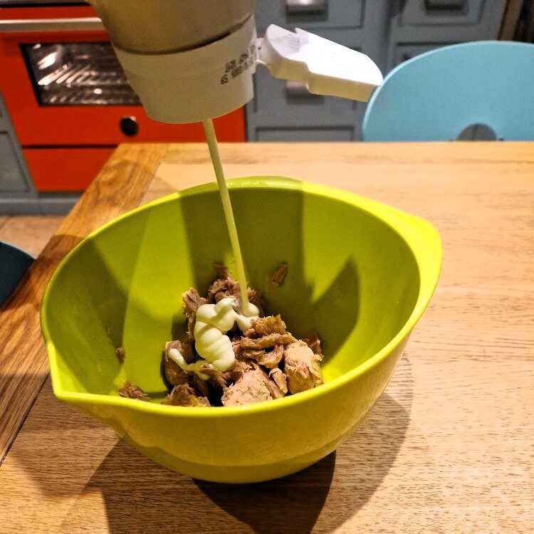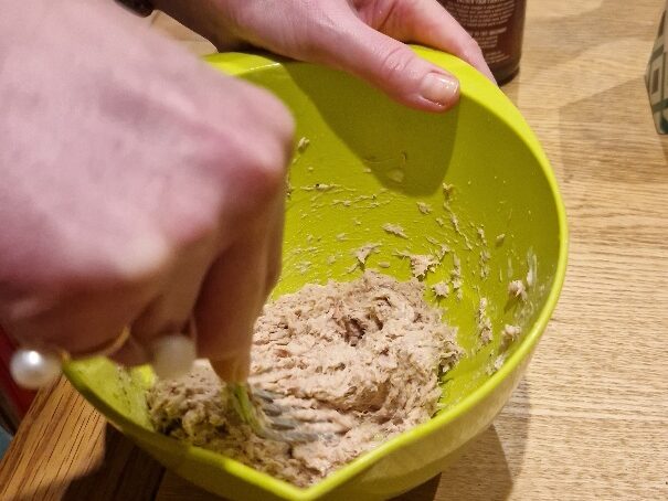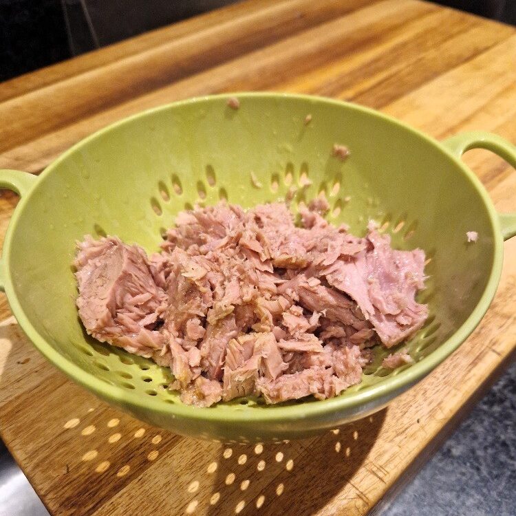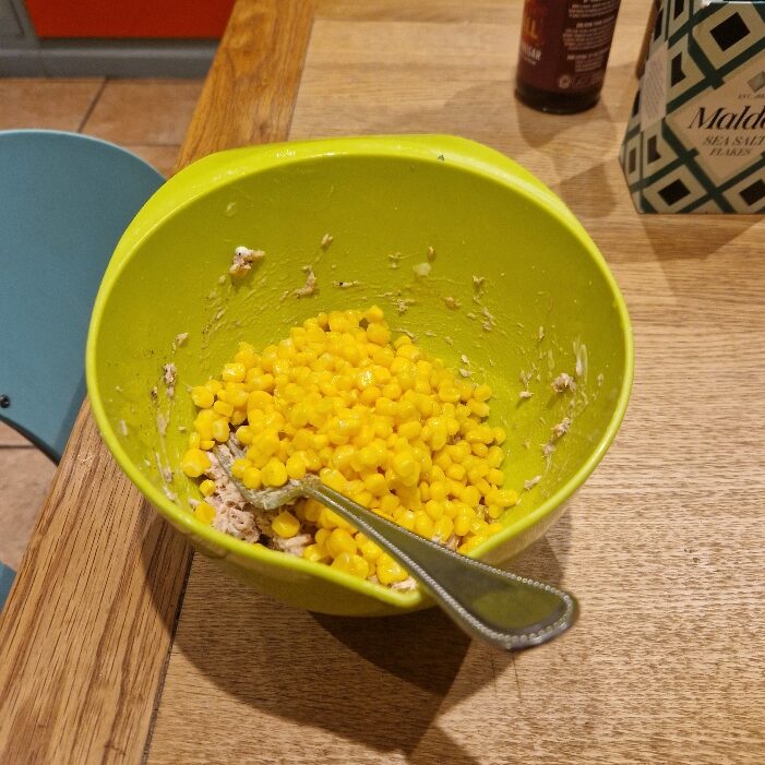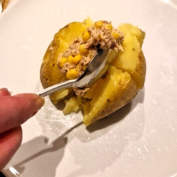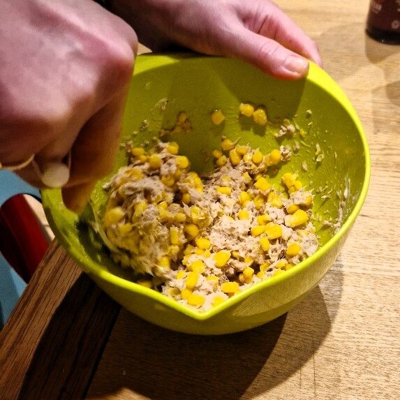While the potatoes are cooking, prepare the tuna sweetcorn filling. Drain the tuna – we prefer tuna in oil or spring water, not in brine, and steaks rather than chunks – then add some mayonnaise and mash thoroughly with a fork. We like to use a Light mayo, but any one you prefer is fine. One small can of tuna will generously fill two large potatoes.