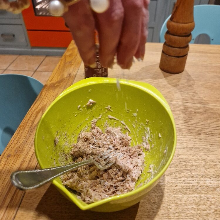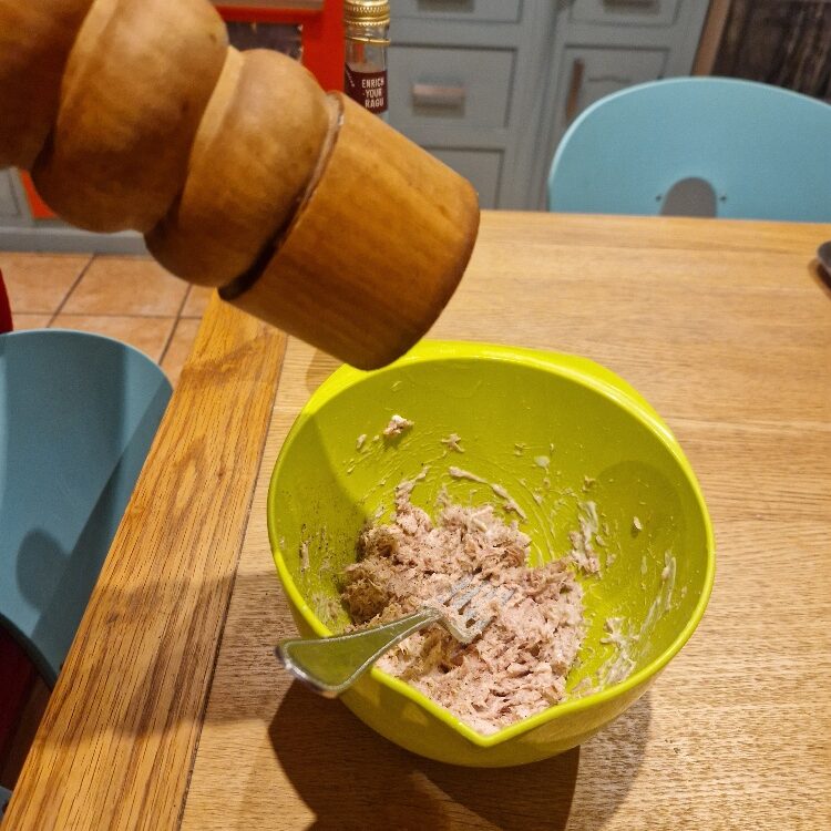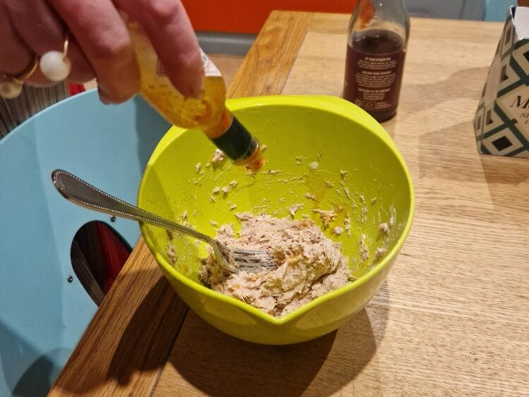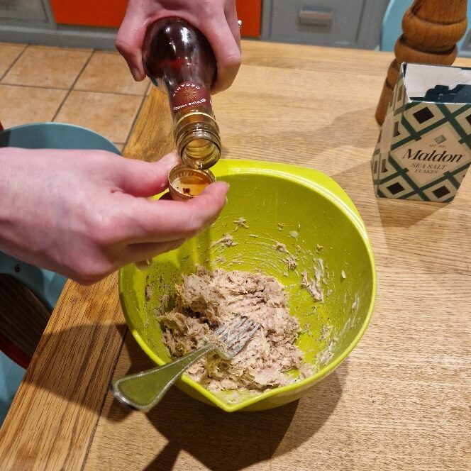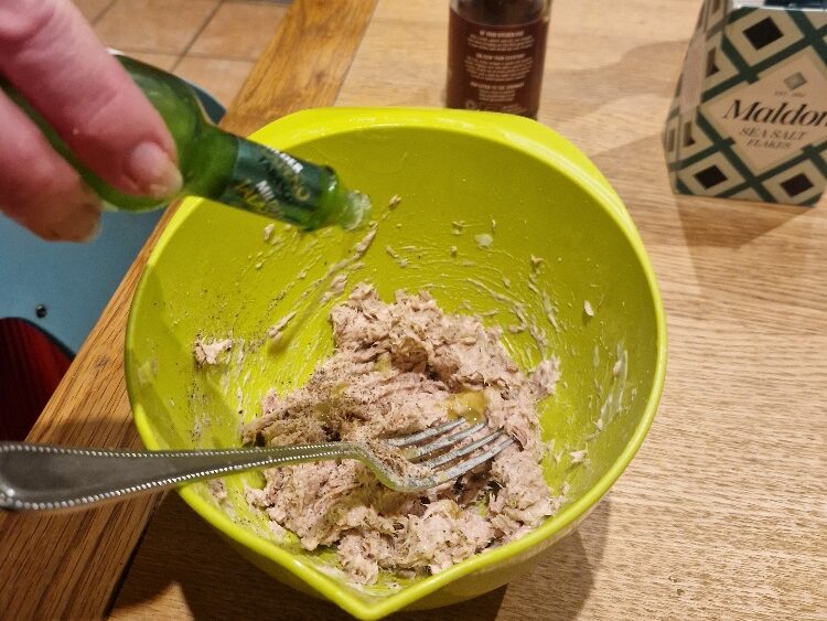 Season with a little salt, and a generous grind of black pepper. Add a capful or two of vinegar (or lemon juice) to taste. We also like to add a little hot sauce – today we added green Tabasco, which goes well with tuna, plus a small shake of red Tabasco to add a little more heat. Stir well, taste, and adjust with any of the flavourings until you like it.