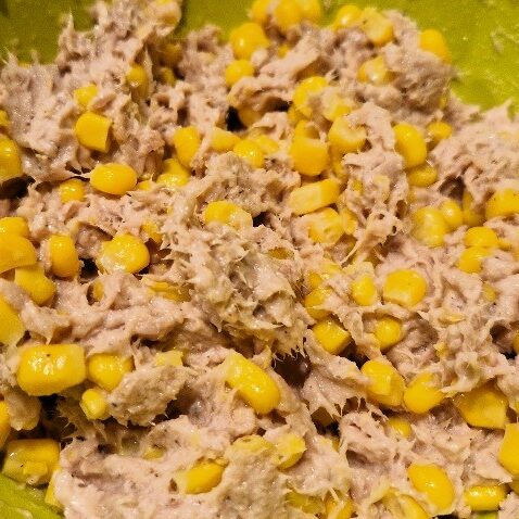 Now drain and add the sweetcorn, a small can per can of tuna. Mix well to combine. Your filling is ready, and it’s very good in sandwiches too! You can make it ahead and keep in the fridge until your potatoes are done.