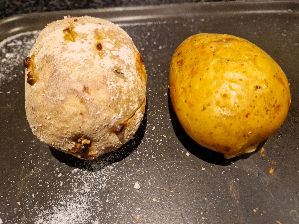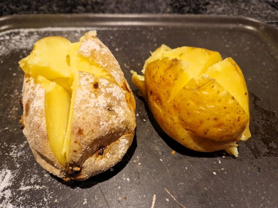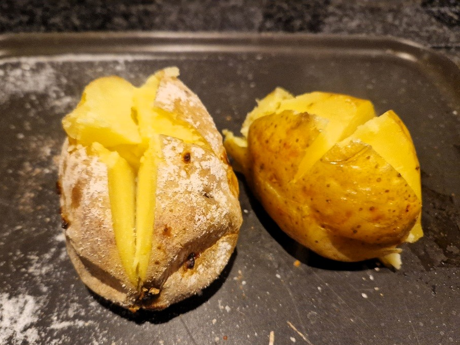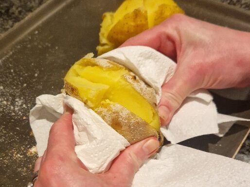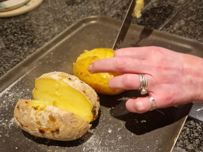 When the potatoes are done, cut a cross in the top of them and push the sides together to open the potato and fluff up the flesh. See more details in our baked potato Tip. Your potatoes are ready to fill.
