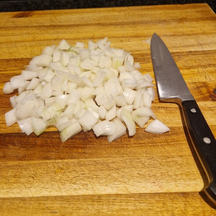 1. Chop the onions, fairly roughly as these are the only vegetables giving texture to this dish. See our onion Tip. De-rind and chop the bacon with scissors.
