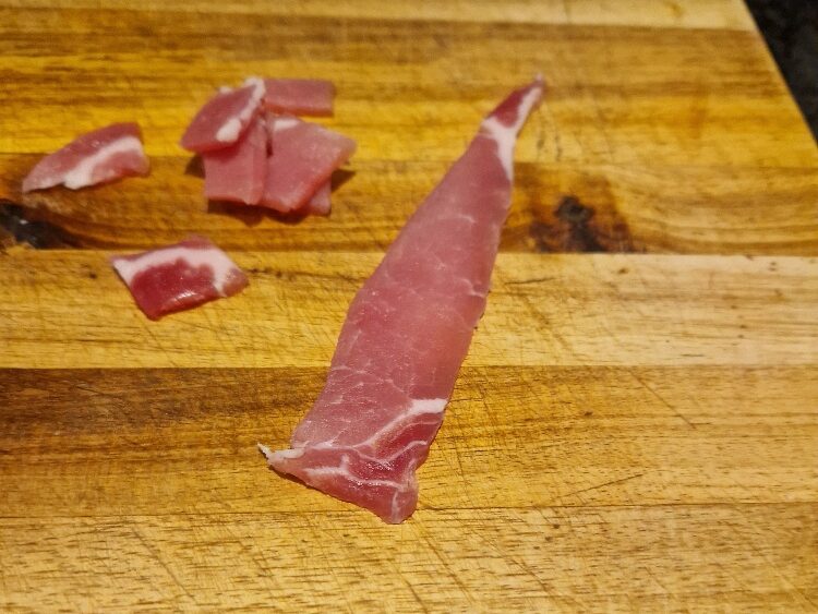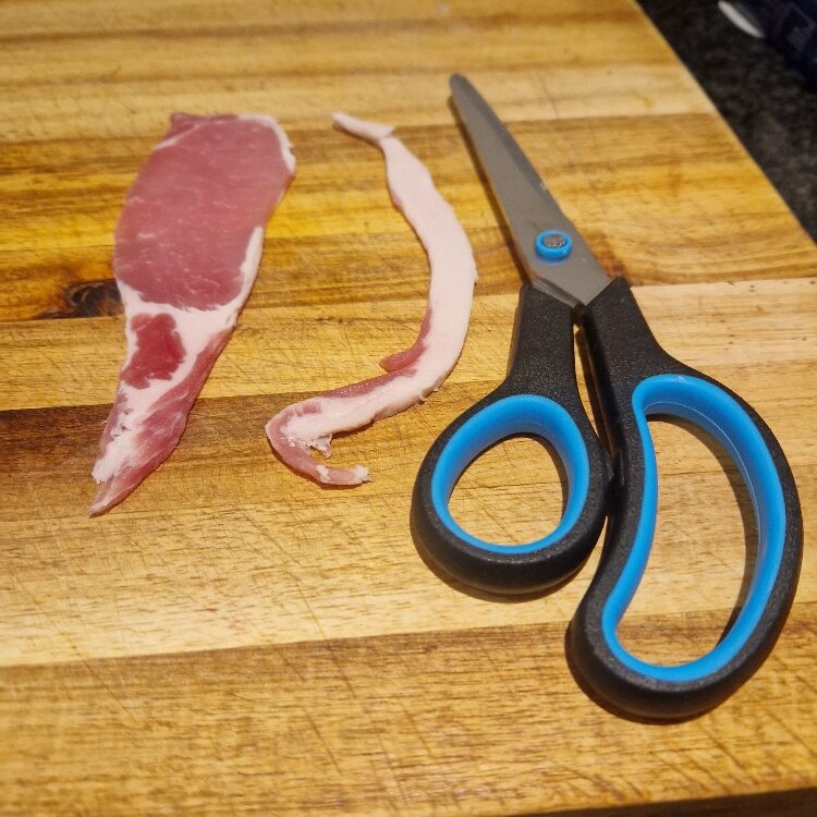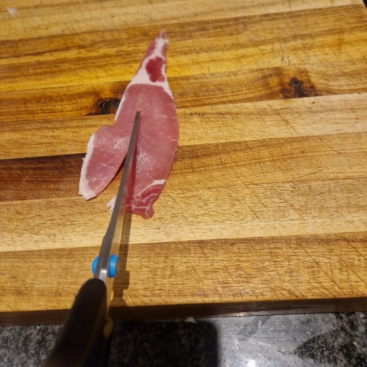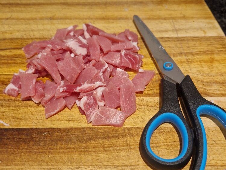 Now chop the bacon into medium sized pieces, again using scissors, as below.