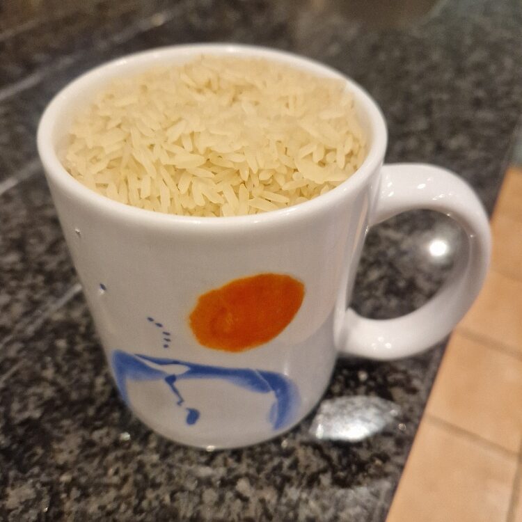 You can now add your rice. How much depends on how many you are serving. Today we wanted enough for two greedy people, plus leftovers. A tip for measuring rice is to use a mug. A fairly large standard mug filled to the brim is enough for about 3 to 4 generous portions. Or you can weigh your rice, and about 100g per person is a good rule to aim for.