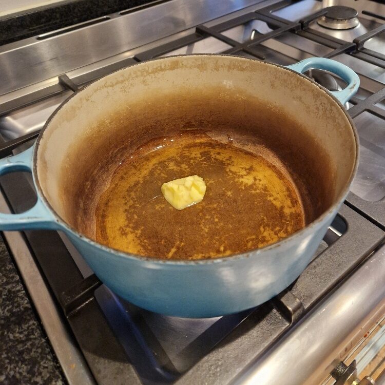 Put a casserole dish or large, high sided saucepan or frying pan over a medium heat, and add a knob of butter. Also add a generous glug of olive oil.