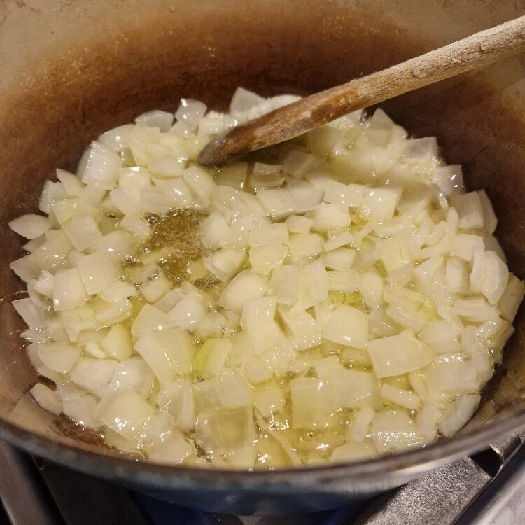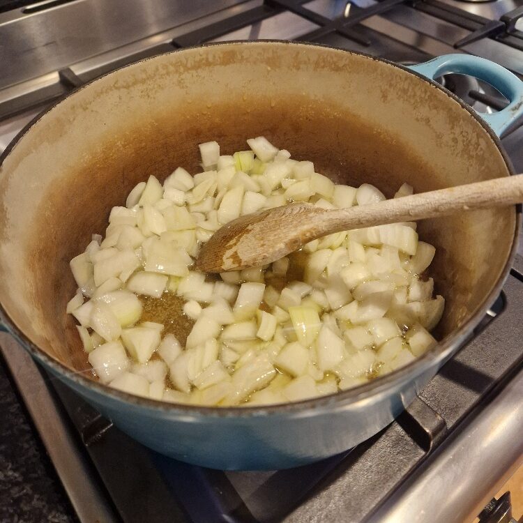2. Heat the olive oil (about 2 or 3 tablespoons) in a large, high-sided frying pan or a large saucepan on a high heat. Turn the heat down to medium and tip the onions in. Keep them moving around in the oil until well coated and they begin to soften, the onions will start to go translucent, about 4 mins. Do not overcook – you want them to keep a slight crunch/bite.