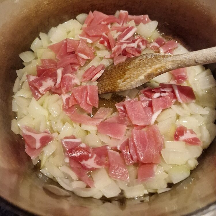Now turn the heat up high and add your bacon. Keep stirring until it is cooked through, a few minutes, otherwise it will stick. You can tell when it is ready as the bacon will turn from reddish to pink or brown – make sure all the bacon no longer has any red, and that the fat is rendered as much as possible (rendering means the fat melting so you can no longer see it). You won’t get crispy bacon in this dish and you don’t want it – a soft, ham-like texture for the bacon here is part of the dish’s charm (and is a reason we don’t tend to use streaky here). You can see the colour difference between raw and cooked below: