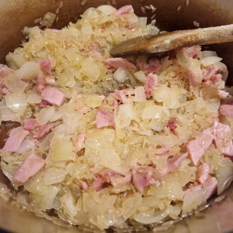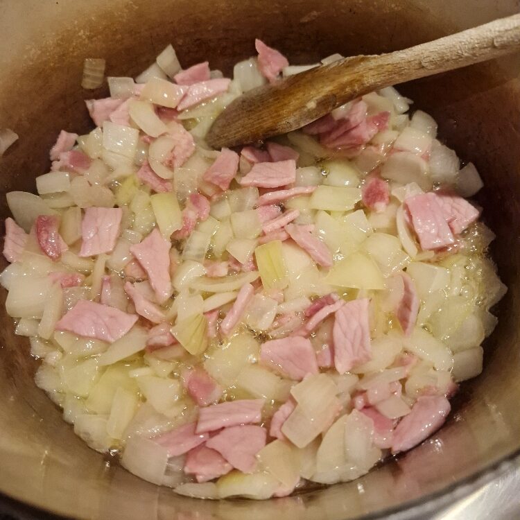 3. Turn the heat back up and add the bacon. Stir until the bacon looks cooked (no red) and the fat renders. Do not allow anything to burn; turn the heat back down if this looks like happening.