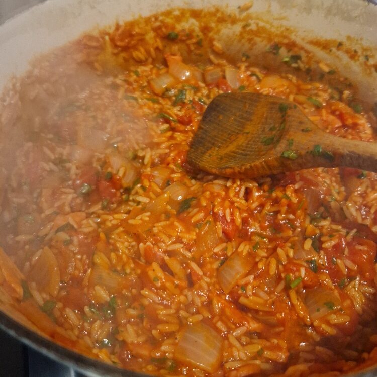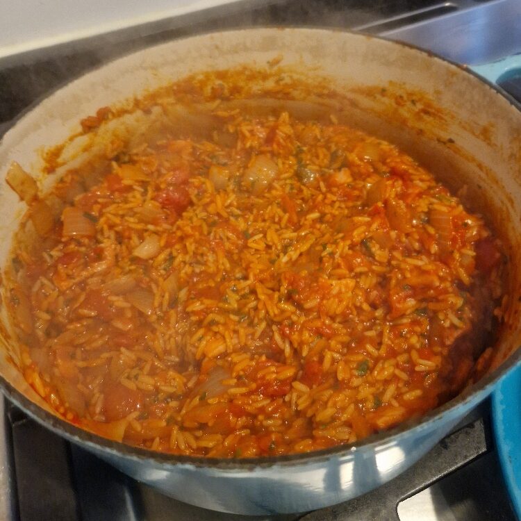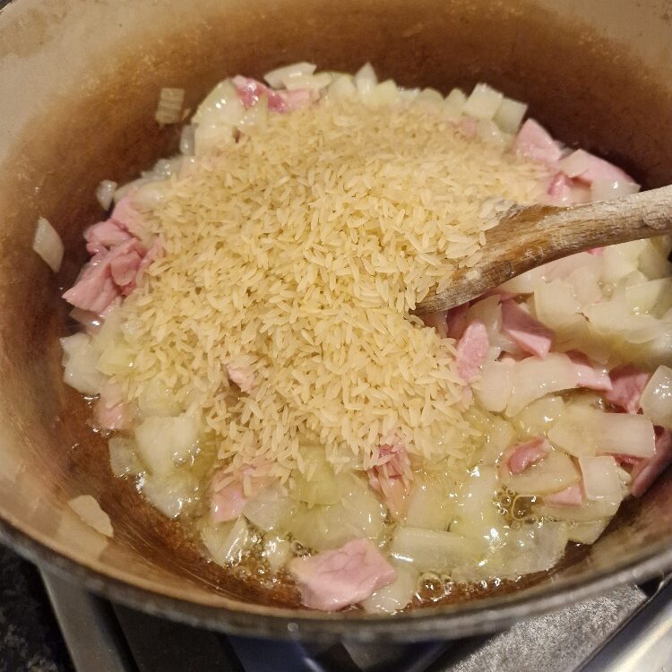 The ingredients are all store cupboard or fridge staples, and this is a dish that you can quickly rustle up for supper, and it’s tastier than its simplicity suggests. What makes it more of a pilaf than a risotto is that it uses long grain rice, and doesn’t require the constant stirring of the traditional type. This gives it a more robust texture, which, if not classic, is still very nice and also allows it to keep much better.