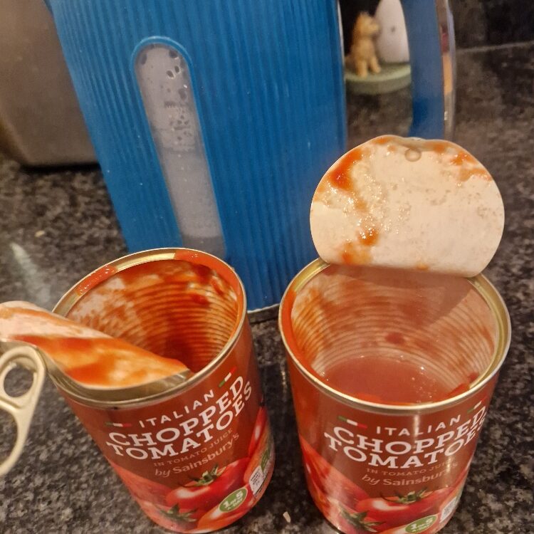 5. Add the tinned tomatoes, stir, and make sure they come to the boil. Crumble in the stock cubes and add a really big squeeze of tomato puree. Add a good slug of Worcester sauce, and if wanted a small splash of Tabasco (do not add too much).
