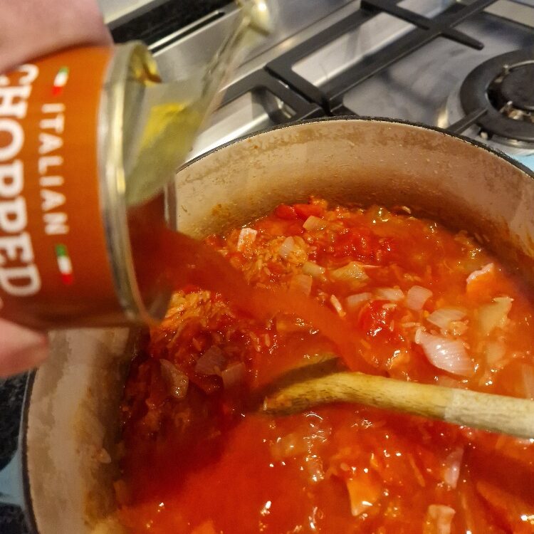 You’ll probably need a little more liquid at this stage too. You can use a generous splash of boiling water, but we like to use a tip we call the ‘tomato tin trick’. Add a splash of boiling water to one tomato can, swirl it around, and tip into the other can and swirl again. Add to the pan. This way you get tomatoey liquid into the dish not just water.