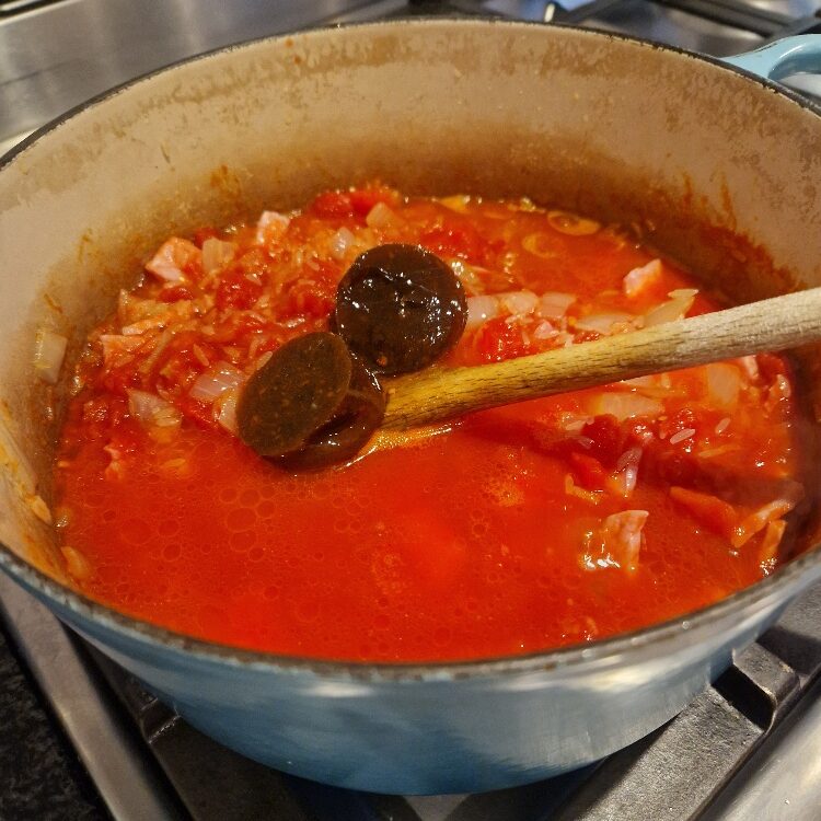 It’s also a recipe that will get you started with a few techniques you will use in lots of later recipes – chopping onions, herbs and bacon, adjusting seasoning, working with tinned tomatoes etc. And it’s a classic one pot dish that’s quick and simple to prepare, with easy to find ingredients and very little special equipment. It also keeps well and is perhaps even nicer the next day, and very good cold too!