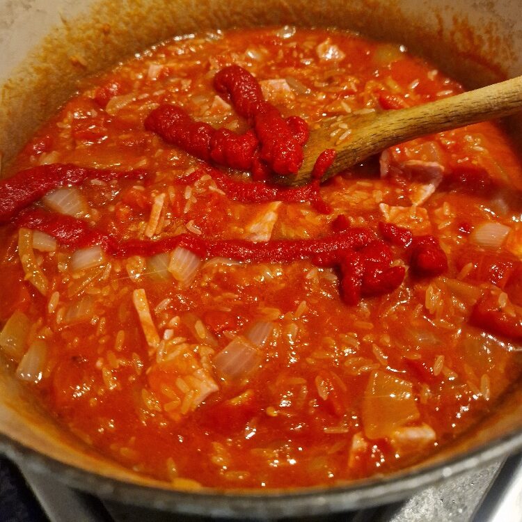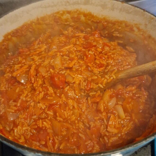 Keep stirring and tasting your rice and adjust as necessary. Towards the end of the cooking time, if it still seems too watery but the rice is cooked, you can take some liquid out with a large metal spoon – press this down onto the rice so liquid runs into the bowl of the spoon. You can also add some more tomato puree which will also thicken it. If it is looking dry and the rice is still hard, add a little more water and stir well. Here are more pictures of the rice as it cooks to guide you – the final image is what you are aiming for.