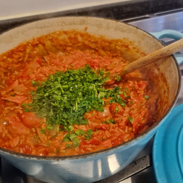 7. Make sure the rice mix is boiling, i.e. it is all bubbling, then turn down the heat to the lowest setting and/or move to a smaller ring (also on lowest). Let it simmer until the rice is tender and the liquid is fully absorbed, i.e. you have firm not sloppy texture – how long depends on the rice and the amount of liquid but between 20 and 30 mins normally. Check every 5 to 10 mins or so for consistency and stir gently to move the rice off the bottom to prevent sticking (it can stick and burn very easily so be vigilant!) but do not over-stir or it will get gluey, and also taste again. Adjust with all the seasonings and water, puree etc as needed. Have a lid handy. You can cook with the lid on or off – lid on will keep it saucier; lid off will help it reduce. It depends on how wet it is – you can chop and change as it cooks.