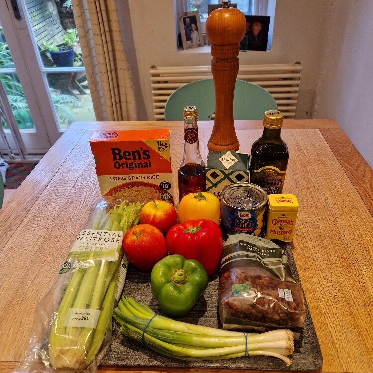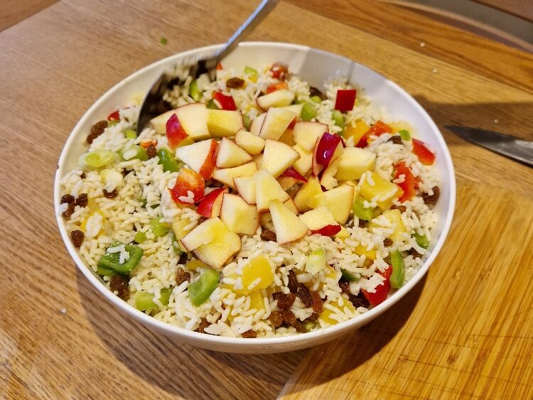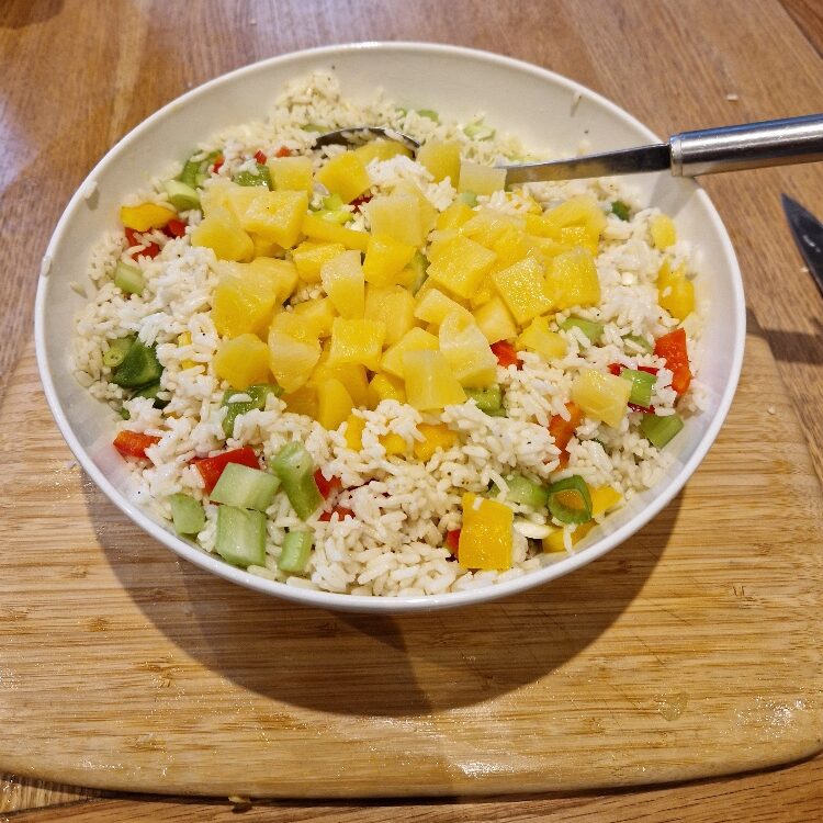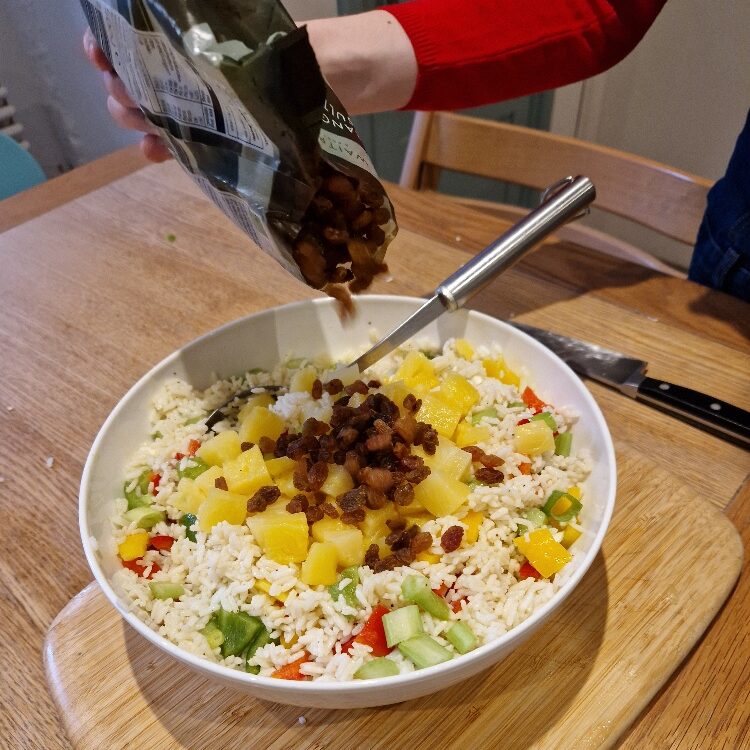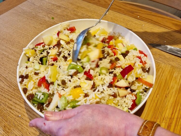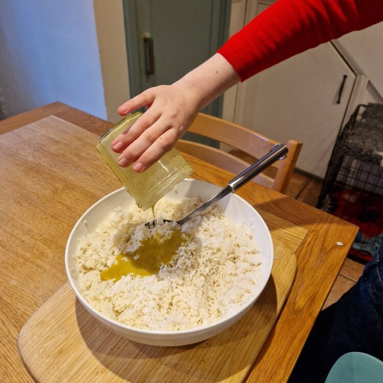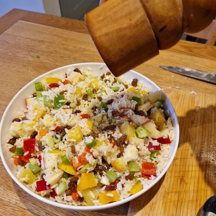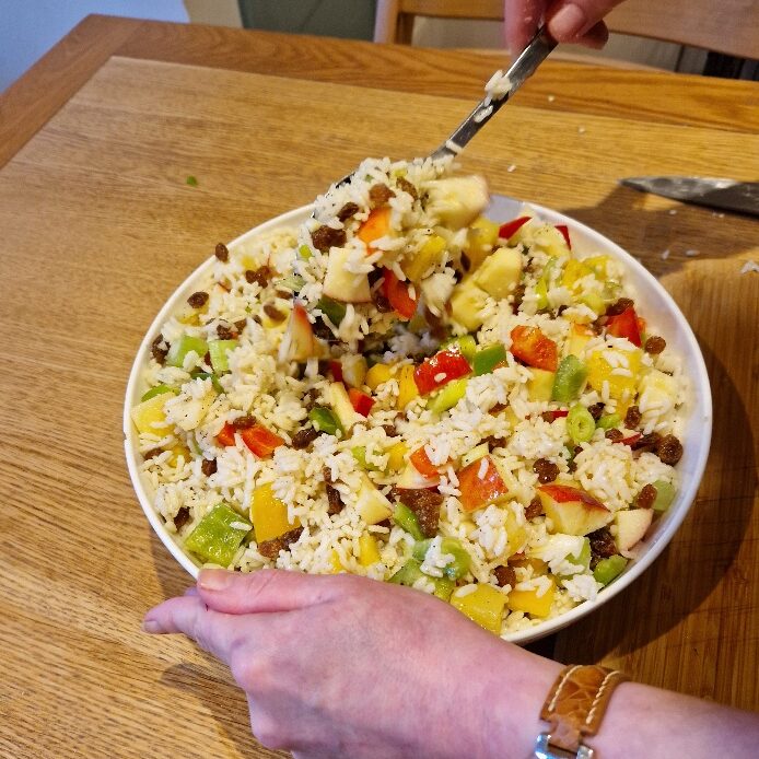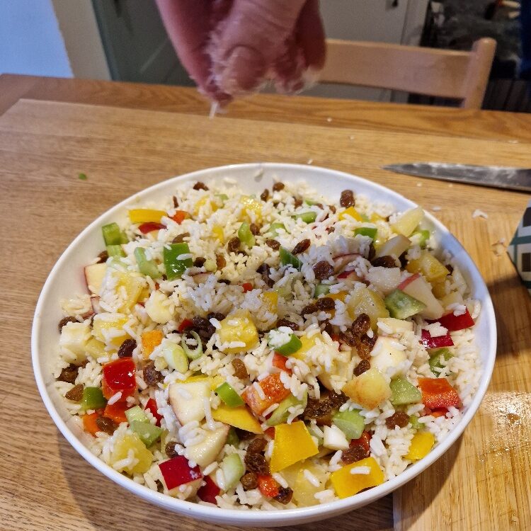 This easy salad is a real family favourite, and was made by Bibi each Christmas on Taid’s birthday (27th December) as he loved it so much, particularly with thick slices of Bibi’s homemade Christmas ham. So now Emily & Estella make it every year on that day too to remember him. It’s really just an exercise in chopping once you’ve cooked the rice and made the dressing.