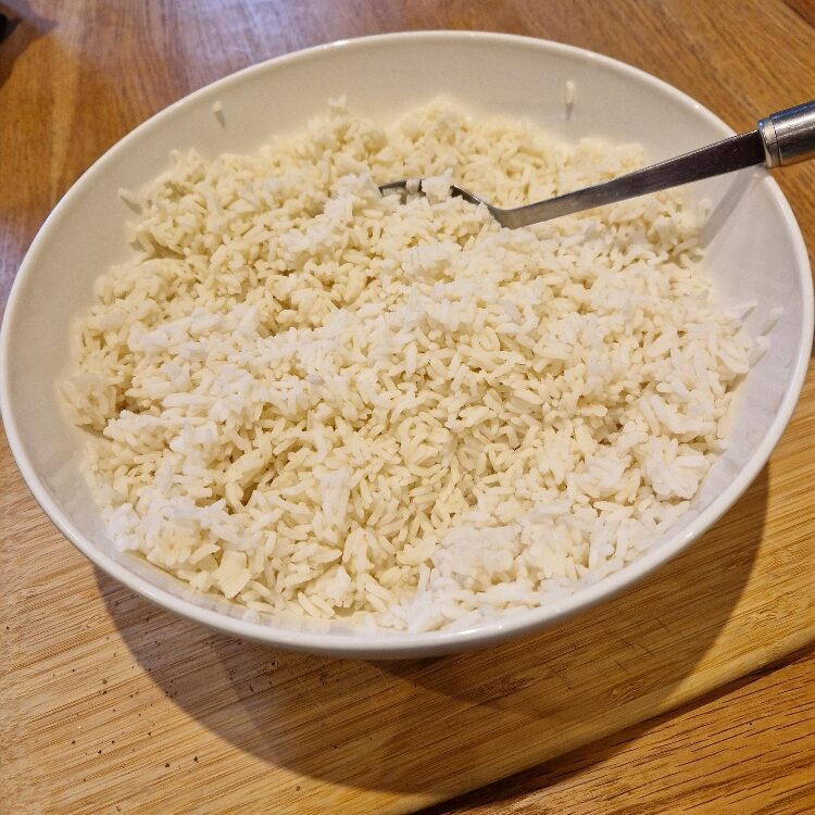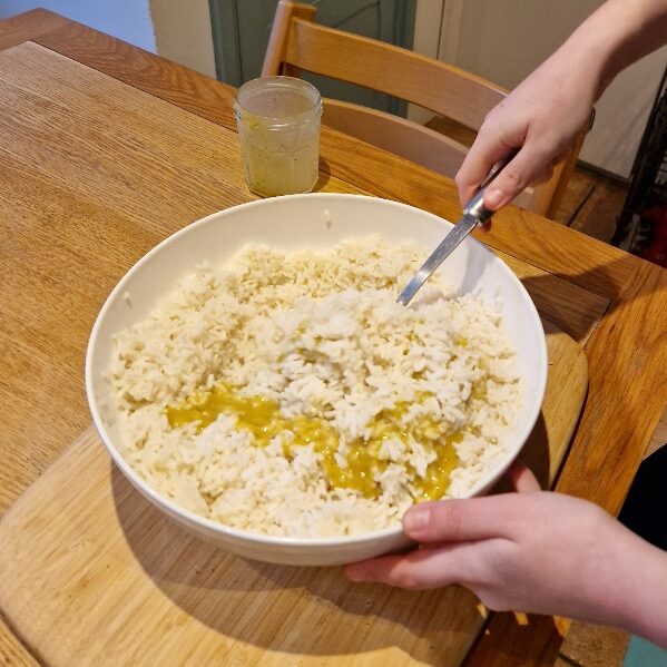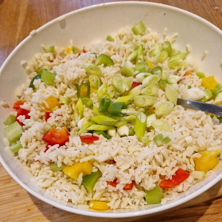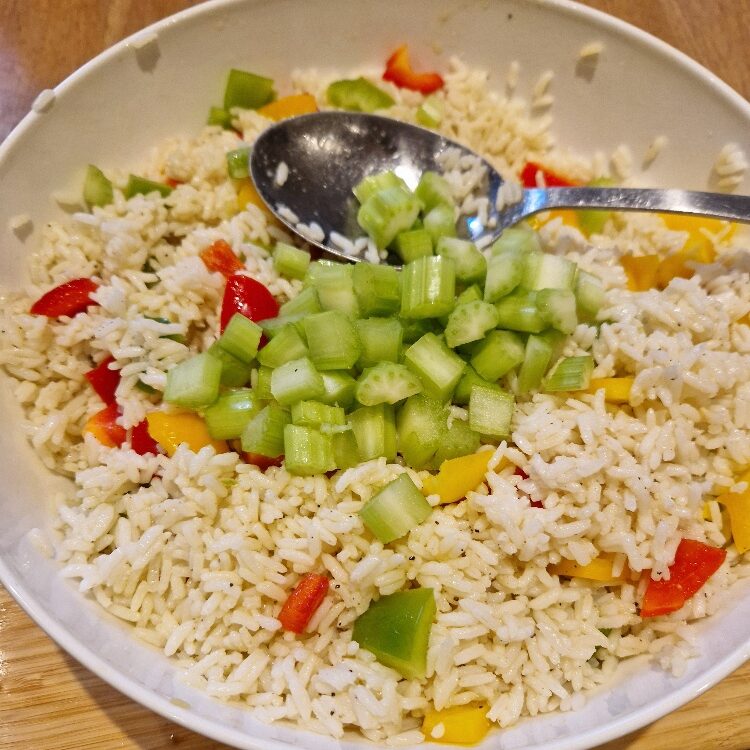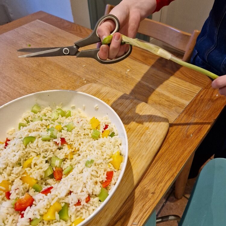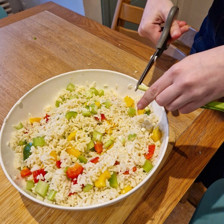 Start by cooking your rice – do this early as you want it to be cool before you add the main ingredients. We think long grain rice is best for this recipe, but you could use basmati if you prefer (it will just give a softer texture). Follow our rice Tip on how to cook it perfectly for lovely, fluffy rice. Today we were making rice salad for a family party so we cooked a LOT. Two cups of dry rice would make a decent sized salad for four to six, and scale up from there.