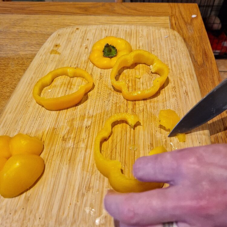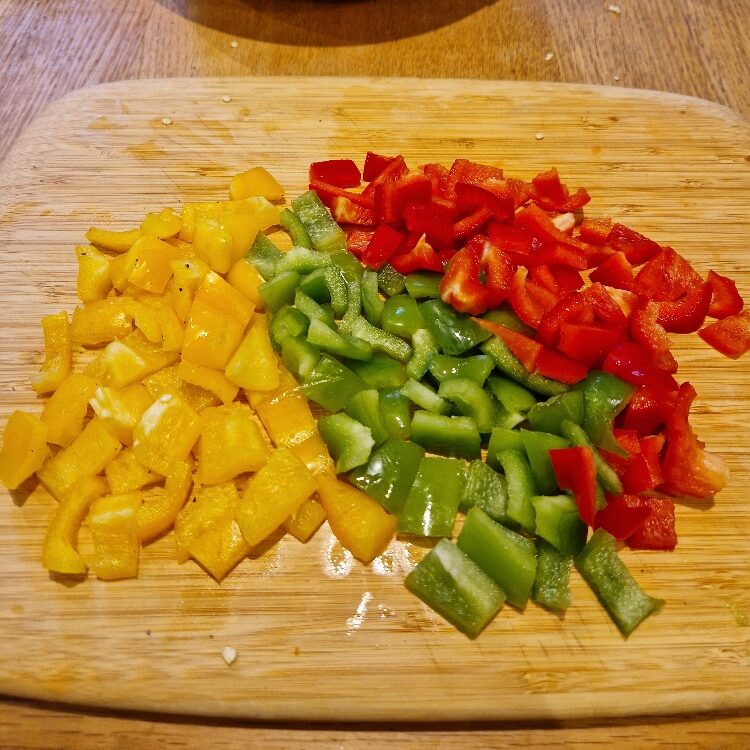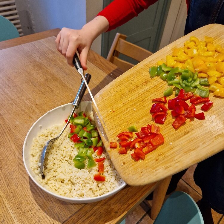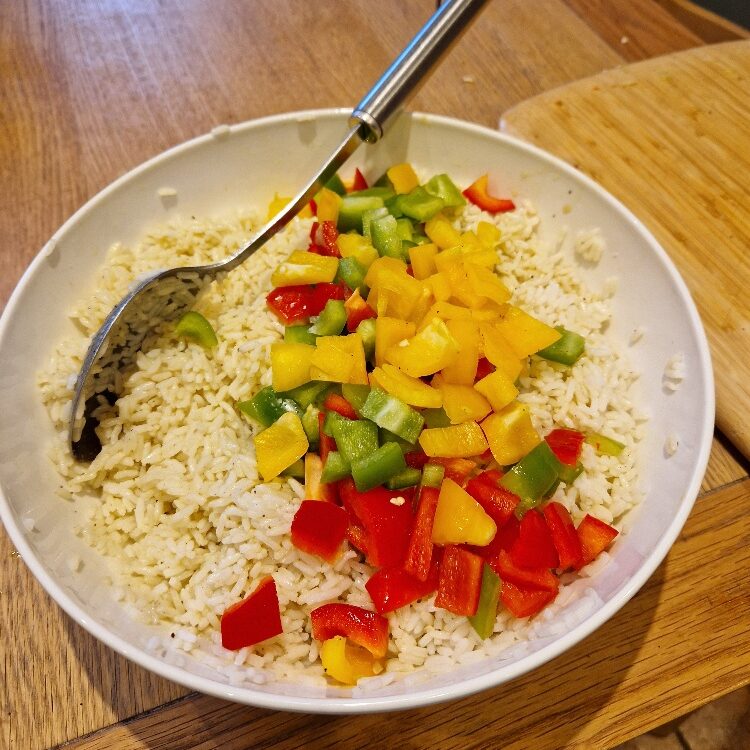 Chop the peppers into rounds, removing the white pith which can be bitter, Chop into bite sized pieces. We use a mix of pepper colours, partly because it looks pretty and festive, and partly because we like the contrast of the sweetness of the red or yellow peppers with the bitterness of the green. Add to the rice.