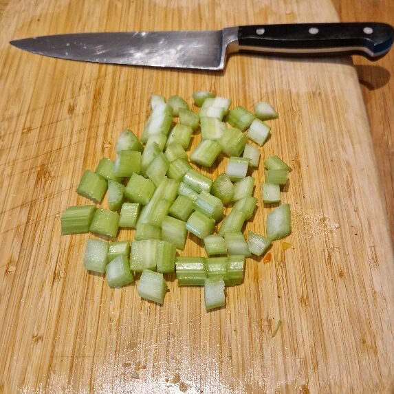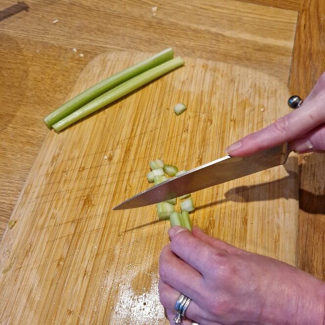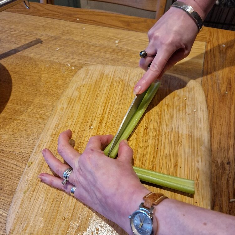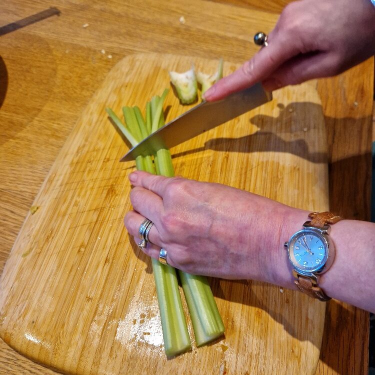 Now chop the celery, we only use a little for crunch. Top and tail the stalks. Today our stalks were quite wide, so we then sliced into two lengthwise before chopping.