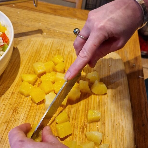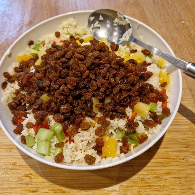 Next chop the tinned pineapple. Tinned pineapple is a good product, but always choose the sort in natural juice, not syrup, for this dish. A better quality grade of tinned is also worth the extra cost. Today we had chunks, so cut each one in half. If using rings, just chop each one into bite sized pieces. Add to the salad. Also add sultanas to taste (we like quite a lot).