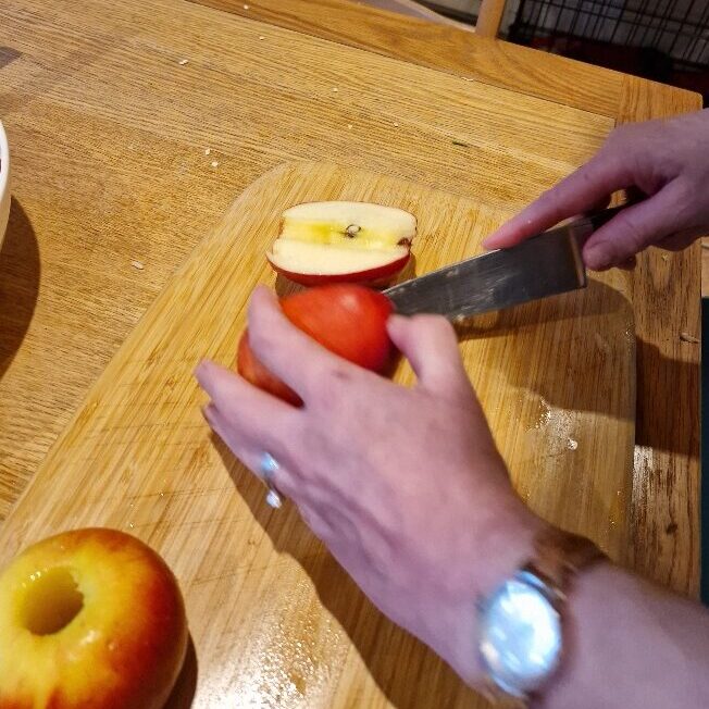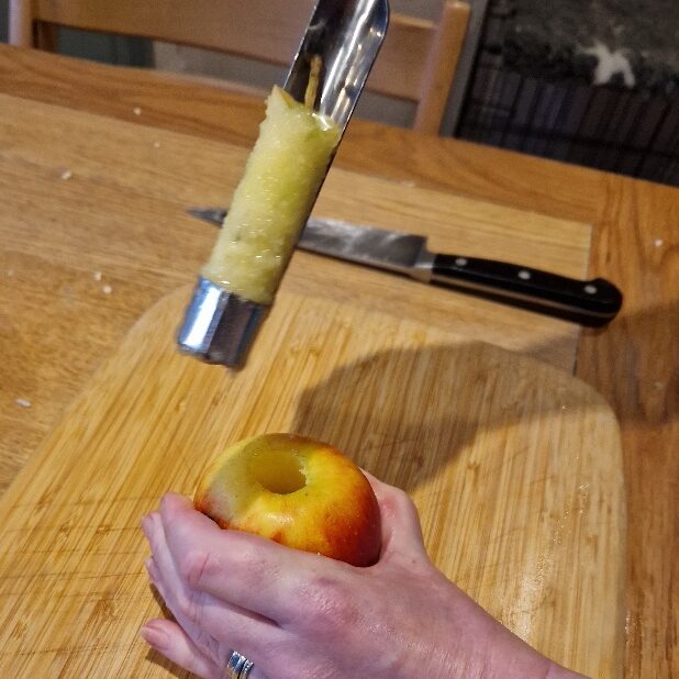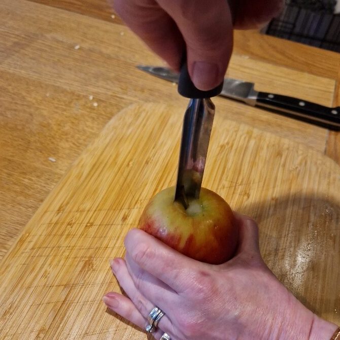 Stir everything in really well, then finally prepare the apple. We use a red apple, but any type you like will do. Remove the core – we have a corer, but if you don’t just cut the apple into quarters and cut the centres out. Working quickly, chop into bite sized pieces and add to the salad immediately. Stir well again.