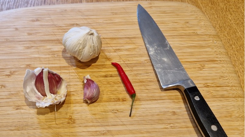 To chop garlic, chilies and other small ingredients that need to be finely chopped, you need to learn the ‘rocking’ knife technique. Just follow these steps.