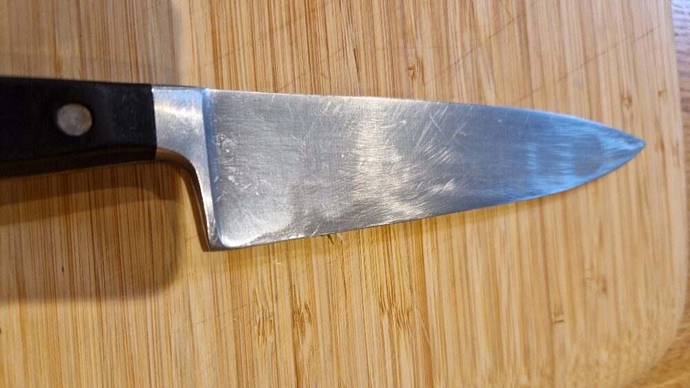 The knife you use must be a cook’s knife with a tapered blade. They come in various sizes but all have this shape:
