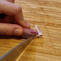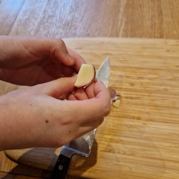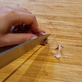 First top and tail your garlic clove, i.e. cut a small section off the top and bottom. Then peel off the dry purple skin. You should end up with a nice, clean clove: