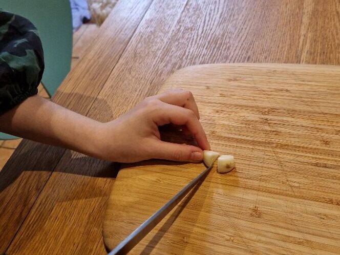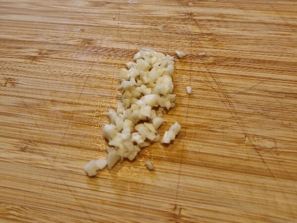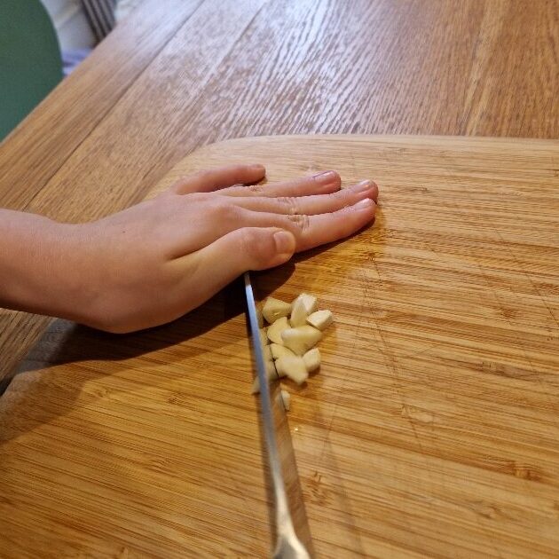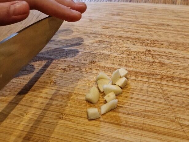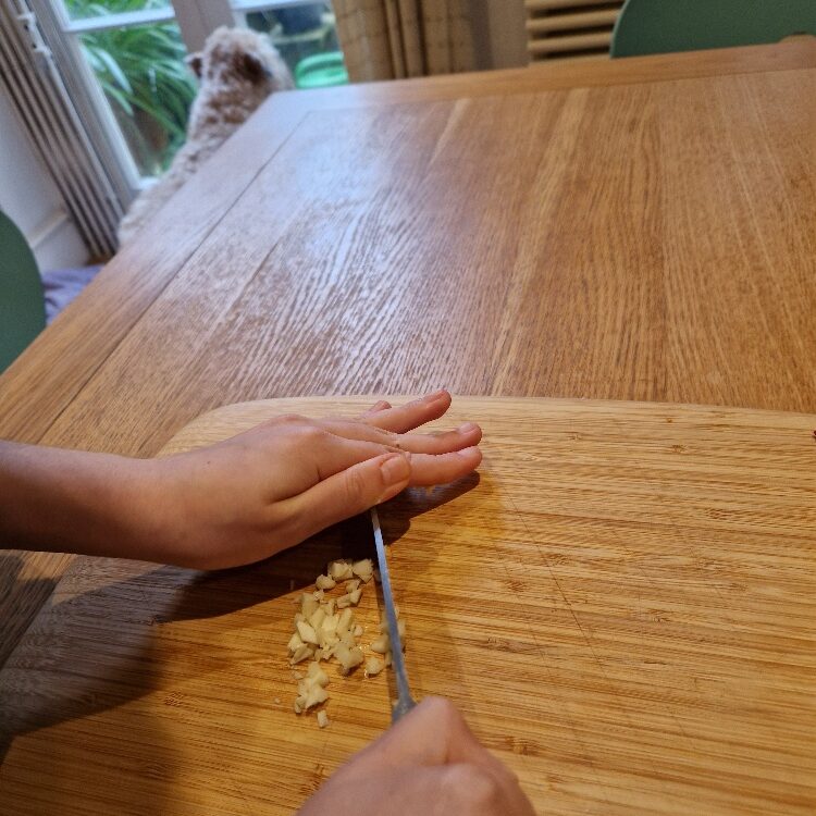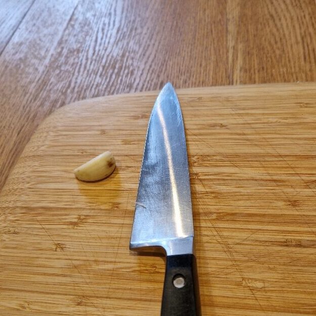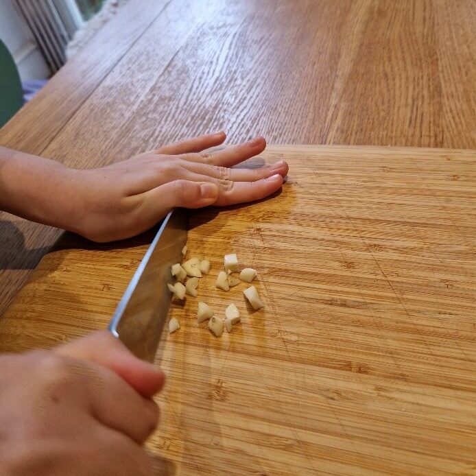 You’ve now got perfectly chopped garlic! You can pick it up on the blade of your knife and add straight to the dish you are cooking, or set aside.