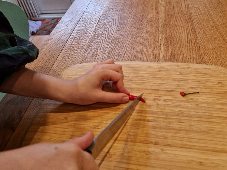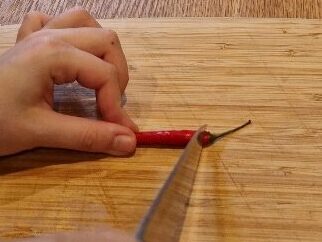 Chopping chillies is very similar, in that you need to rock the knife. You also start by top and tailing, i.e. cutting the stalk end off and a small section of the tip:
