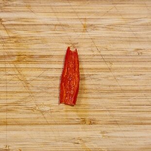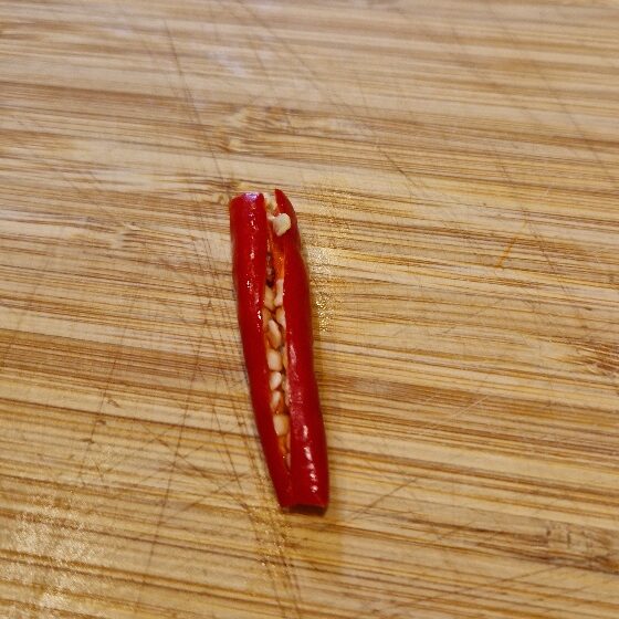 You now need to prep your chilli for chopping. Chillies vary in spiciness, but generally the heat is focused in the seeds and, particularly, the white or pale internal pith. Keep these if you want is spicier; remove if you don’t. The below is a bird’s eye chilli and very hot so we removed the seeds and pith. Slit the chilli along its length, then remove the interior: