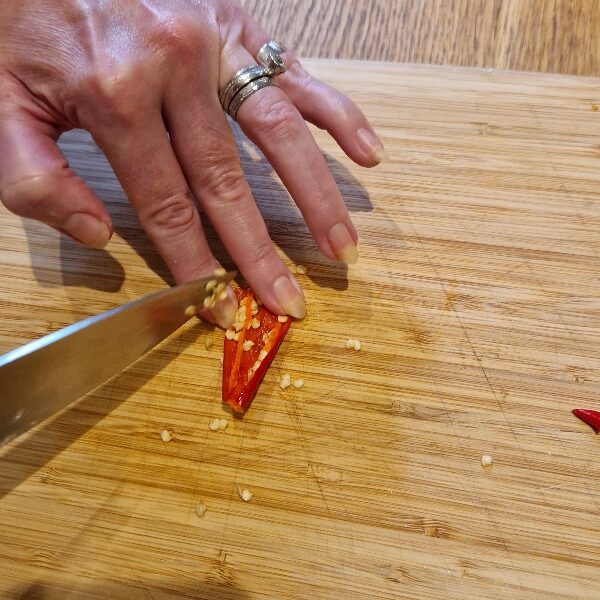 Chillies come in all shapes and sizes, and all levels of heat. In general, the smaller ones are hotter – but do taste before adding to make sure. Whatever the size, the method to chop them is the same.
