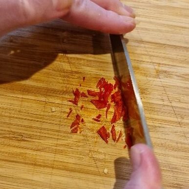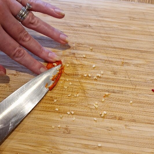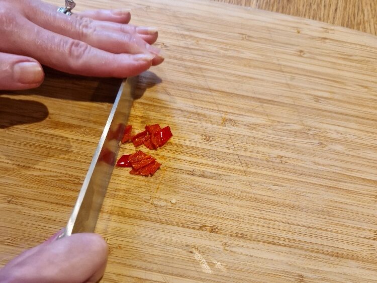 Well done, you now have a perfectly chopped fresh chilli! You can slide this onto the blade of your knife and add directly to your dish, or set aside.