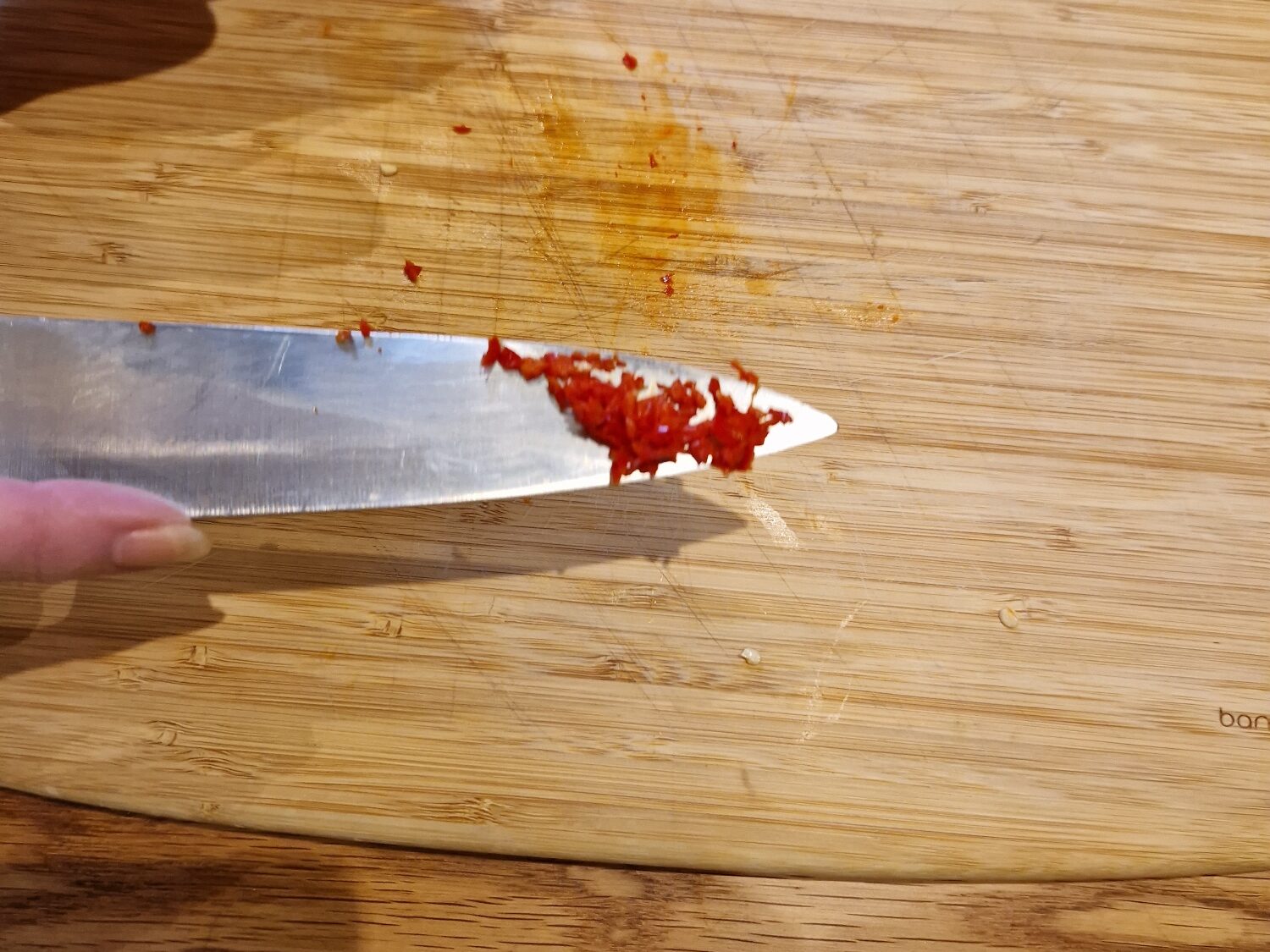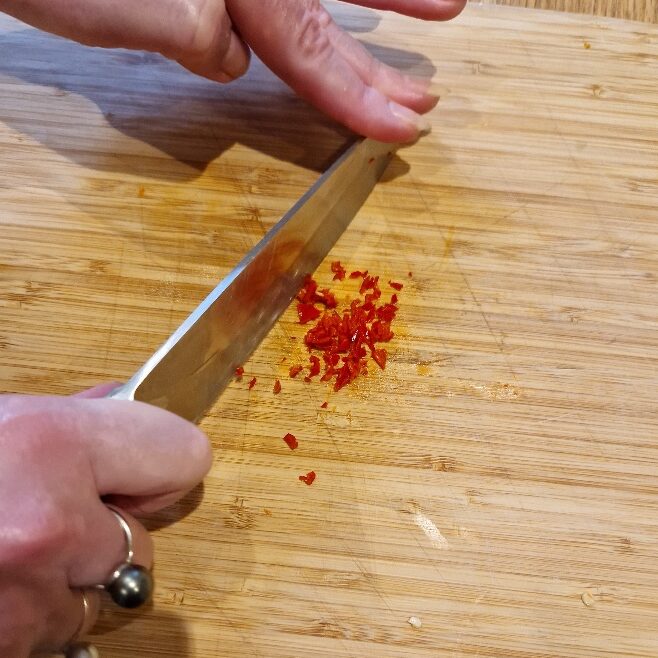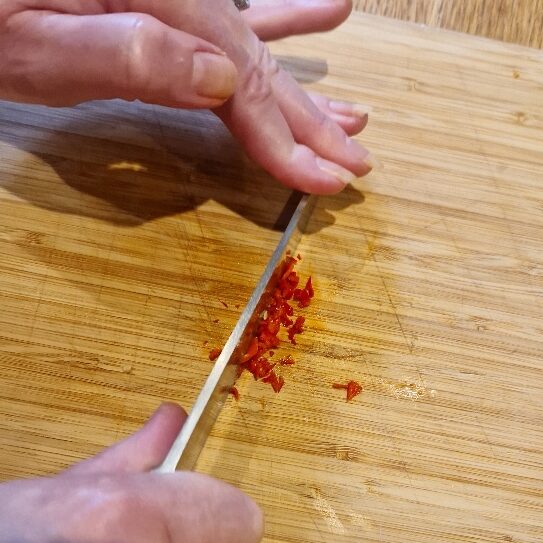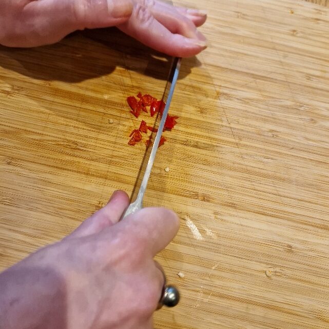 You are now ready to ‘rock’ your knife over the chilli to chop fine. Do this as in the garlic example above, i.e. put one hand on the top of the tip of the knife to anchor it, and rock the knife up and down over the chilli using the handle: