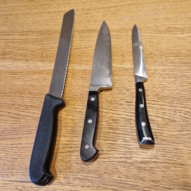 1 Bread knife, for bread and large veg 2 Medium chef’s knife, multipurpose 3 Small serrated knife, for delicate items