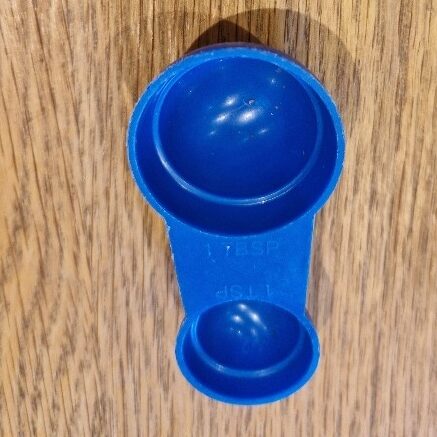 Cheap and useful double ended measure. Small end is tsp and ½ tsp; large end is tblsp and ½ tblsp