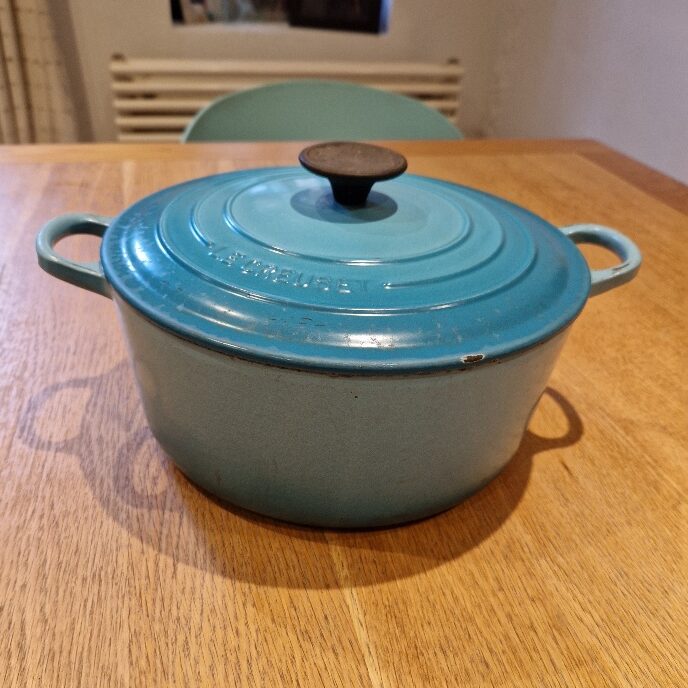 Heavy with lid, can be used on hob or in oven. For stews, casseroles, large sauces, braising etc