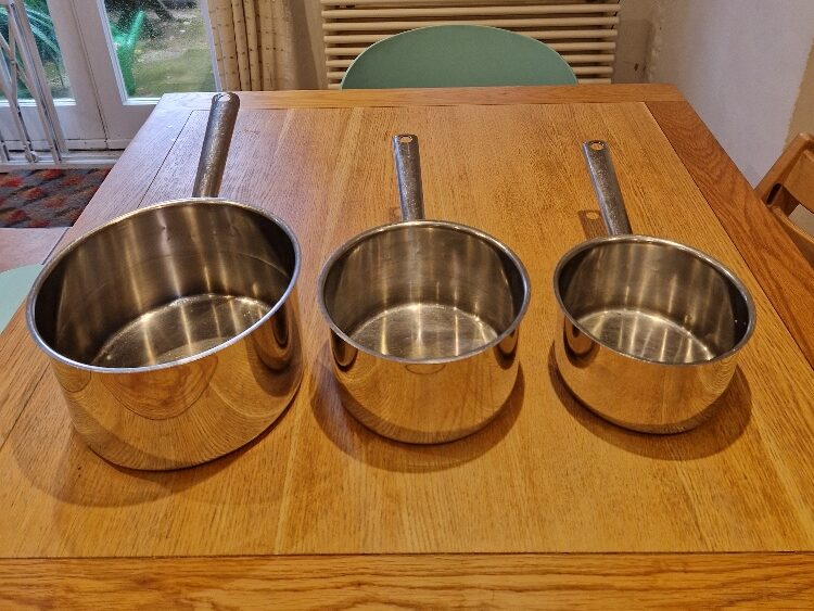 1 Large, for boiling and stews 2 Medium, multipurpose 3 Small, for smaller items – eggs milk etc